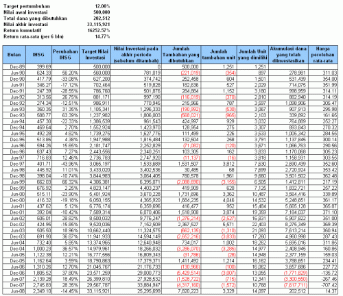 Pada tulisan kali ini saya akan membahas mengenai strategi investasi Value Averaging atau biasa disingkat VA. Konsep dari strategi ini adalah membuat pertambahan nilai investasi kita akan selalu tetap. Misalkan kita menginginkan nilai investasi kita bertambah sebesar Rp 500.000,- setiap bulannya. Jika kita menerapkan strategi value averaging, maka kita akan menambah atau mengurangi investasi kita sehingga pertambahan nilainya akan tetap (Rp 500.000,-) setiap bulannya. Pada akhir bulan pertama, kita menginvestasikan dana kita sebesar Rp 500.000,-. Dengan ketentuan seperti di atas, maka pada akhir bulan kedua nilai investasi kita harus menjadi Rp 1.000.000,-. Jika pada akhir bulan kedua ternyata nilai investasi kita meningkat menjadi Rp 550.000,-, maka kita hanya perlu menambahkan dana sebesar 1.000.000 – 550.000 = Rp 450.000,-. Dengan demikian, pada akhir bulan kedua, nilai investasi kita akan sesuai dengan target yaitu Rp 1.000.000. Proses ini dilanjutkan pada bulan-bulan berikutnya. Mirip dengan strategi Dollar Cost Averaging, skema strategi di atas mempunyai satu kelemahan. Dalam beberapa tahun ke depan, seiring dengan inflasi mungkin pertumbuhan konstan sebesar Rp 500.000,- akan terasa kecil. Oleh karena itu kita perlu melakukan sedikit ”modifikasi” agar pertumbuhan investasi kita dapat mengatasi efek inflasi. Apa yang harus kita lakukan? Agar nilai pertumbuhan dapat mengatasi efek inflasi, maka target pertumbuhan kita nyatakan dalam persentase. Dasar dari konsep ini sama dengan skema sebelumnya. Hanya saja, jika dalam skema sebelumnya kita menargetkan pertumbuhan Rp 500.000,- setiap bulan, maka pada skema ini kita menargetkan pertumbuhan dalam persen katakanlah 3% setiap bulannya. Jadi pada akhir bulan kedua, kita harus membuat nilai investasi kita menjadi (1 + 3%) x Rp 500.000,- = Rp 515.000,-. Pertumbuhan sebesar itu dapat dicapai dengan meningkatnya nilai investasi maupun tambahan dana dari kita. Mungkin pertumbuhan sebesar 3% atau Rp 15.000,- pada akhir bulan kedua tersebut terasa kecil namun nilai 3% tersebut akan terasa besar pada tahun-tahun mendatang. Dengan mengubah bentuk pertumbuhan menjadi persentase, maka kita telah memecahkan permasalahan yang ditimbulkan oleh inflasi. Satu hal yang perlu diingat jika nilai investasi kita melebihi target, kita akan menarik sejumlah dana kita agar nilainya sesuai dengan target yang telah ditetapkan semula. Lalu apa kelebihan dari strategi Value Averaging ini? Contoh yang akan saya berikan ini berdasarkan data IHSG 6 bulanan sejak tahun 1989. Mengapa saya menggunakan data IHSG dan bukan NAV reksa dana saja? Data yang digunakan adalah data 6 bulanan karena jika terlalu singkat, subscribe dan redeem fee kita akan membengkak. Mari kita perhatikan simulasi berikut (klik pada gambar untuk memperbesar) :