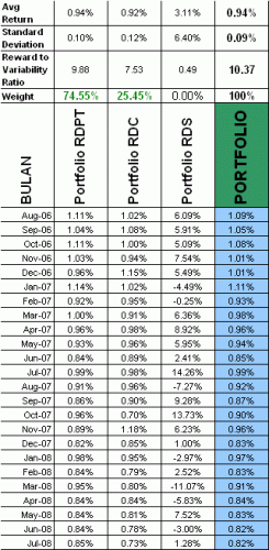 Keterangan: Mengenai apa saja RD penyusun portfolio optimal RDPT, RDC dan RDS serta berapa komposisi optimal RD-RD tersebut saya agak merasa kurang enak menyebutkannya :p Yang penting kita telah mengetahui prinsip dari optimalisasi portfolio reksadana. Sebenarnya metode ini dapat lebih dimanfaatkan karena dengan metode ini kita bisa mengeset seberapa besar return dan risiko portfolio kita. Dengan kata lain, kita seakan-akan dapat membentuk "reksadana" kita sendiri di mana profil risk dan returnnya kita yang menentukan. Demikian adalah penjelasan singkat mengenai optimalisasi portfolio. Sepertinya memang masih kurang detil. Memang materi ini adalah materi yang cukup berat. Mungkin penjelasan yang lebih detil bisa dimasukkan ke dalam KDR :) Tergantung kebijaksanaan Bro Gebet saja lah selaku pemiliki warung ini :D Gimana Bro?