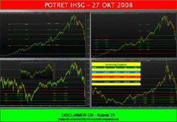 TA sebagai tools untuk membantu kita memutuskan melakukan aksi memang sangat beragam sekali aplikasinya, kalau kata Wan Al. "selama lo untung lo benar" mau pake TA atau FA. Saya sendiri setelah belajar sana sini..coba2 untuk melihat kemungkinan pergerakan IHSG dengan tarik menarik garis (asik juga ternyata....). Kali ini garis yang saya tarik dari tahun 2003 dengan menyentuh beberapa candlestick hingga tanggal 16.09.08 dengan penutupan di 1735 (wew..jauh amat ya.., namanya juga coba2)...ternyata garis tersebut membentuk support (menurut saya nih) yang menahan IHSG untuk jatuh lebih dalam, kalau menggunakan fibo dengan menarik garis dari tahun 2203 k3 2008, 50%nya ada diarea 1735 juga dan ternyata besoknya rebound. Aneh bin ajaib....dua indikator tadi mengatakan hal yang sama.. nah sekarang pertanyannya seberapa jauh reboundnya...?