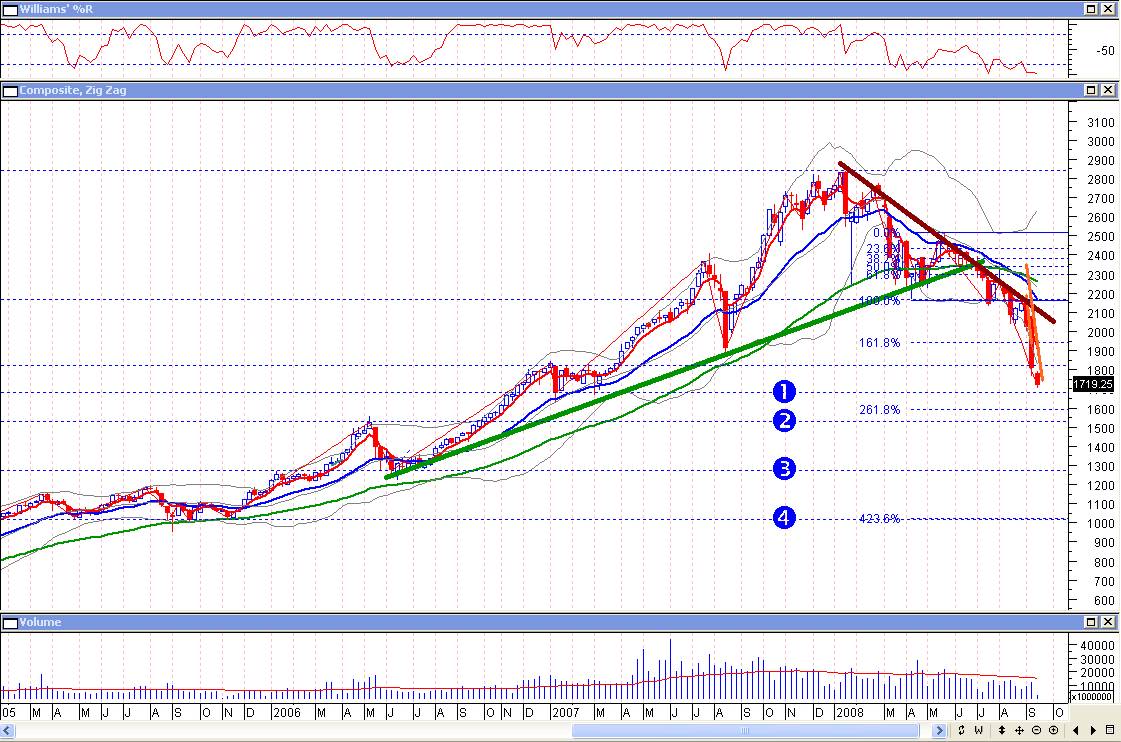 Terlepas dari apakah anda adalah seorang swing trader seperti saya (yang suka berski ria di tengah gelombang bursa) atau penganut passive investment (bogle style), momen kejatuhan bursa harus kita celebrate untuk menambah portfolio kita. Pertanyaannya bagaimanakah kondisi bursa saat ini dan dimanakah potensi terbesar kita untuk masuk ke bursa ? Berikut ini saya bagi view saya terhadap IHSG dalam mid term perspective dengan menggunakan chart weekly per tanggal 15 September 2008. Seperti biasa karena ini mencerminkan pendapat saya pribadi, DISCLAIMER IS HIGHLY ON. Ini bukan saran untuk melakukan investasi atau tidak melakukan investasi, dalam melakukan investasi setiap investor harus melakukan assesment independent dan mengerti terhadap seluruh resiko dari keputusan yang diambil