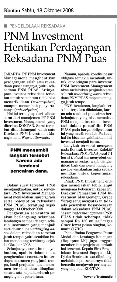 Yth Bro Autogebet, Dear rekan portal reksadana, saya adalah salah satu nasabah RDPU PNM PUAS yang terkena rush redemption pada tanggal 13 Oktober 2008 lalu. PNM kemudian menindaklanjuti dengan mengeluarkan surat edaran dengan no: 368/PNMIM/LTR/X/08 yang bertujuan untuk membekukan PNM PUAS maks 9 bulan karena dikhawatirkan akan terjadi rush redemption yang berkelanjutan Dalam surat edaran tersebut diberitakan pula bahwa "Selama masa penghentian sementara ini, PNM akan melakukan auto redemption setiap bulan baik berupa pokok maupun bunga". Apakah kalimat tersebut menandakan PNM PUAS akan dilikuidasi?