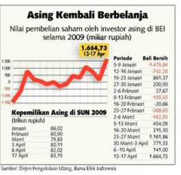 Pertanyaan selanjutnya adalah “kenapa asing giat membeli Rupiah dan menjual Dollar-nya ?” Mungkin ada beberapa penjelasan mulai dari alasan yang berbau fundamental sampai dikaitkan dengan situasi politik pasca pemilu legislative. Tapi saya tidak tertarik membahas hal itu, pertanyaan yang lebih relevan bagi seorang investor adalah “Dipakai untuk apa Rupiah yang dibeli tersebut”. Believe it or not … Rupiah yang diborong itu bukan dipake untuk beli es cendol … tapi buat memborong instrument investasi kita yaitu SUN dan saham di bursa kita. Data yang dipublish harian Kontan beberapa waktu yang lalu menunjukkan bahwa asing mulai mengakumulasi saham di bursa kita. Kapan akumulasi itu mulai dilakukan … Anda boleh percaya boleh tidak … tapi data menunjukkan proses akumulasi yang masif mulai dilakukan sejak pertengahan Maret 2009, tepat saat rupiah juga mulai menguat.