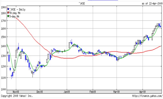 Hasil dari aksi borong Hot Money itu terlihat jelas dalam pergerakan IHSG di bursa kita, bursa kita juga menunjukkan trend penguatan tepat saat asing mulai berbelanja (sekitar pertengahan maret sampai saat ini). Lihat grafik di bawah ini. Dan bila anda seorang pemerhati TA seperti saya (walaupun anda cuma memakai tools TA sederhana yang gratis : Moving Average di Yahoo Finance), tentunya anda sedang bersorak atas signal buy yang telah diberikan TA pada pertengahan Maret yang lalu … hehehe