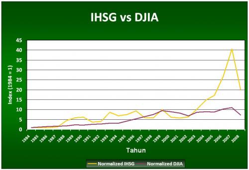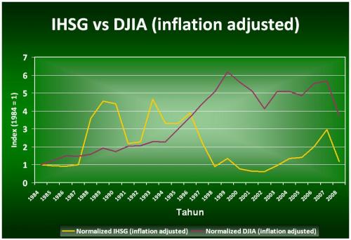 Momok InflasiSayangnya, seperti yang telah saya katakan di awal tulisan ini, kita harus menggali lebih dalam agar dapat “melihat” dengan lebih jelas. Bukannya saya meragukan potensi investasi di Indonesia, akan tetapi globalisasi telah mengubah wajah investasi. Sekali lagi kita perhatikan grafik berikut. Kita masih mencoba membandingkan IHSG dengan DJIA. Namun kali ini supaya tidak terlalu ”polos”, kita sesuaikan dahulu dengan inflasi (inflation adjusted). Langkah ini cukup logis mengingat pertumbuhan nilai investasi kita yang sesungguhnya dapat diketahui setelah dikurangi dengan inflasi. ![]() Tampak bahwa setelah disesuaikan terhadap inflasi, DJIA masih tumbuh sekitar hampir 4 kali lipat. Hal yang cukup menyesakkan terjadi pada IHSG. Krisis global yang menghantamnya membawa nilai riilnya ke level sekitar tahun 1984 padahal nilai tersebut sempat menyentuh 3 kali lipat pada akhir tahun 2007. IHSG sendiri sebenarnya telah mampu mengalahkan inflasi pada sebagian besar periode pengamatan. Nilai riil IHSG terendah terjadi pada kurun waktu 2000 – 2003 di mana setelah disesuaikan dengan inflasi, nilai riilnya lebih rendah daripada tahun 2004. Kemerosotan ini mulai terjadi pada saat krisis moneter (1997) dan menembus level terendah pada tahun 2002 akibat adanya gonjang-ganjing politik. Lepas tahun 2003 nilai riil IHSG terus meningkat hingga akhir tahun 2007.