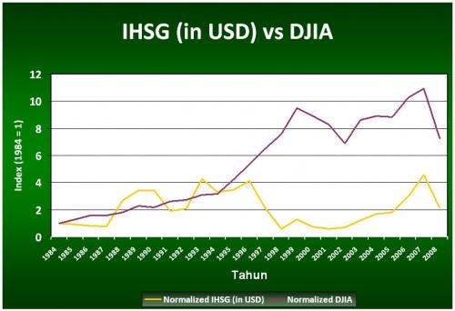 Akankah Kita Bertahan Mengkonsumsi Barang Impor?Cara lain memandang IHSG adalah dengan menyatakannya dalam US Dollar. Mengapa dalam US Dollar? Sampai dengan saat ini US Dollar adalah mata uang yang umum untuk perdagangan internasional. Mari kita telaah lebih lanjut. ![]() Sekali lagi kita dipaksa untuk terhenyak. Perubahan nilai tukar Rupiah terhadap US Dollar selama 24 tahun terakhir ternyata efeknya sangat besar terhadap nilai sesungguhnya dari IHSG. Dalam US Dollar, IHSG hanya naik sebesar dua kali lipat jika dibandingkan dengan tahun 1984. Perlu diketahui bahwa pada tahun 1984, nilai 1 USD adalah sekitar Rp 600. Bandingkan dengan tahun 1998 di mana nilainya sempat berkisar Rp 15.000/USD dan Rp 9.500/USD pada tahun 2009. Obat Penenang Itu Bernama Dividen