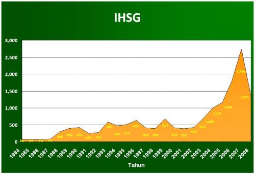 ![]() Pada dasarnya investasi itu sederhana. Sesederhana kita melihat perbedaan antara angka 0 dengan angka 1. Jika suatu investasi berpotensi memberikan keuntungan dengan risiko yang dapat ditoleransi serta mampu mengalahkan inflasi, secara umum dapat dikatakan investasi tersebut cukup layak. Sayangnya, dengan semakin kecilnya dunia, selain kriteria tersebut terkadang kita harus melihat bagaimana perilaku investasi kita dari sudut pandang lain. Melihat IHSG dengan ”polos”Grafik IHSG yang biasa kita lihat mungkin adalah seperti ini. Berikut adalah chart IHSG dari tahun 1984 s.d 2008. Apabila kita menginvestasikan uang kita pada tahun 1984, maka saat ini investasi kita akan tumbuh menjadi 40 kali lipat pada akhir tahun 2007 dan masih memberikan hasil 20 kali lipat walaupun terimbas krisis global tahun 2008. Hal tersebut terlihat menggiurkan dan menjanjikan jalan menuju kekayaan. Untuk memperindah gambaran tersebut, mari kita perhatikan grafik berikut.
