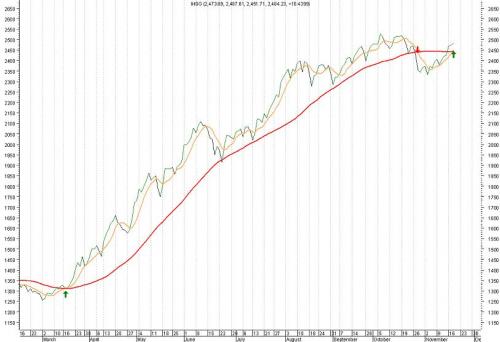 IHSG Great Bull 2003 - 2007 Inilah mungkin salah satu periode yang bisa disebut dengan "IHSG Great Bull". IHSG terbang dari 300 an pada tahun 2003 mencapai puncak tertingginya di 2840 pada tahun 2007 (naik hampir sekitar 10 kali lipat). Terlihat bahwa MA tidak hanya memberikan sinyal beli secara konsisten seiring dengan kenaikan IHSG namun juga peringatan akan adanya kejatuhan. Contohnya adalah sinyal jual yang diberikan pada bulan Agustus 2007 yang dapat menghindarkan kita dari kejatuhan IHSG sebesar 300 poin.