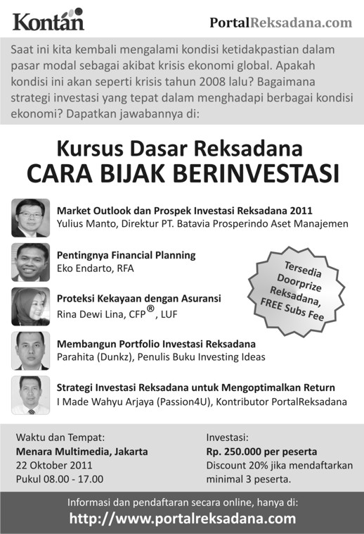rekans, barusan baca Kontan hari ini, ternyata Kontan membuat event talkshow dg tema "strategi investasi reksadana di masa sulit". Investasinya Rp. 250rb untuk talkshow setengah hari (09.00 - 12.00).