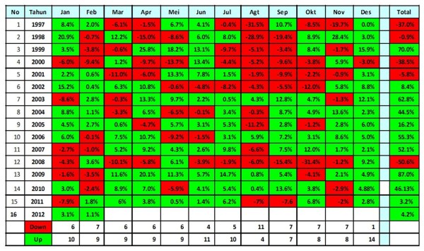 ![]() Sejak pasar saham ada, selalu saja ada periode dengan volatilitas tinggi dan alasan untuk tidak berinvestasi. Kekhawatiran akan terjadinya resesi ekonomi, skandal korporasi, perang, krisis kredit dan perumahan serta berbagai hambatan ekonomi lainnya dapat mempersulit investor untuk tetap yakin dan fokus pada tujuan investasi jangka panjangnya. Meski demikian, adalah sangat penting untuk tetap berinvestasi dan mengkaji investasi anda secara sistematis. Pertanyaan yang paling sering ditanyakan adalah “Seberapa besar imbal hasil yang bisa saya dapatkan dengan berinvestasi di pasar saham dan apakah investasi tersebut layak?” Jika menilik data pasar saham Indonesia, IHSG terbentuk pada tanggal 10 Agustus 1982, hampir 20 tahun yang lalu. Lebih lanjut, sejak 30 Desember 1983 sampai 3 Desember 2011, IHSG membukukan imbal hasil sebesar 4.363,90% atau setara dengan 14,52% per tahun. Banyak investor yang mengharapkan imbal hasil sebesar ini per tahunnya, akan tetapi mereka tidak sadar bahwa pasar saham adalah pasar yang sarat akan volatilitas dan rentang imbal hasil yang lebar. Dengan volatilitas dan ketidakpastian pasar saham, mengapa investor masih mau berinvestasi di pasar saham? Dibandingkan asset class lainnya seperti efek pasar uang (tabungan, deposito berjangka) dan obligasi, saham memiliki kinerja yang terunggul. Bagi banyak orang, saham merupakan bagian dari rencana investasi jangka panjang guna memenuhi tujuan investasinya. Setiap kali dana mengendap di tabungan atau instrumen investasi dengan tingkat imbal hasil yang rendah, maka dana tersebut dapat dikatakan berkurang setiap harinya. Jika dana tersebut tidak bertumbuh sama dengan atau lebih tinggi dari tingkat inflasi, maka dana tersebut akan tergerus inflasi. Alasan lain untuk tetap optimis dan berinvestasi adalah bahwa bear market secara historis berlangsung relatif singkat, sementara bull market biasanya diawali dengan lonjakan tajam dan berlangsung cukup lama. After all, yang dinamakan krisis itu pasti tidak berlangsung lama; karena kalau lama maka bukan krisis lagi namanya. Krisis selalu diiringi dengan urgensi untuk memperbaiki keadaan karena tidak ada seorangpun di dunia ini yang senang mengalami krisis; semua tentu ingin kembali ke kondisi normal, keluar dari keterpurukan. Tabel di bawah ini mencantumkan imbal hasil IHSG setiap bulan sejak Januari 1997 sampai Februari 2012. Jika kita perhatikan, tampak bahwa selama kurun waktu kurang lebih 15 tahun periode dengan imbal hasil negatif berlangsung lebih singkat dari periode dengan imbal hasil positif. Selain itu jumlah periode dengan imbal hasil positif juga lebih banyak daripada periode dengan imbal hasil negatif: 109 vs. 73. Bahkan jika kita amati secara tahunan, ternyata hanya ada 5 tahun yang membukukan imbal hasil negatif, sementara 10 tahun lainnya positif. Jadi sebenarnya investor punya cukup waktu untuk menutupi kerugiannya di bear market dan bahkan membukukan laba selama bull market! Tabel 1: Kinerja IHSG 1997-2012