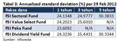 Kinerja pasar saham tentunya akan terefleksikan dalam kinerja reksa dana saham. Mari kita lihat kinerja historis reksa dana saham kelolaan First State Investments Indonesia berikut ini: Dari tabel di atas terlihat bahwa semakin panjang horison investasinya, makin besar imbal hasil yang bisa diraih oleh investor. Sebagai contoh, jika seorang investor berinvestasi di reksa dana FSI Sectoral Fund maka jika ia berinvestasi selama setahun maka ia memperoleh imbal hasil 17,01%; sedangkan jika ia berinvestasi selama 5 tahun maka imbal hasil yang diperolehnya adalah sebesar 18,30% dan jika ia berinvestasi sejak reksa dana ini diluncurkan pada tahun 2005 maka imbal hasilnya adalah 23,28% per tahun. Lebih lanjut penulis mencoba menganalisa volatilitas masing-masing reksa dana untuk periode 1, 3 dan 5 tahun, sebagaimana diukur lewat standar deviasi. Dalam ilmu statistik standard deviasi menyatakan seberapa besar dispersi atau penyebaran suatu kumpulan data dari nilai rata-ratanya. Semakin besar standar deviasi berarti semakin lebar penyebaran datanya. Jadi untuk reksa dana dengan imbal hasil rata-rata sebesar x% dan standar deviasi sebesar y% selama 1 tahun, berarti selama periode 1 tahun tersebut imbal hasil reksa dana bervariasi dari (x-y)% sampai (x+y)%. Pada teorinya, semakin panjang periode investasi maka semakin kecil standar deviasinya, namun jika menilik data di bawah ini, ternyata yang terjadi justru sebaliknya! Mengapa demikian? Karena dalam periode 5 tahun terakhir terjadi krisis finansial – tahun 2008-2009 terkait krisis kredit perumahan (subprime mortgage crisis) di Amerika Serikat yang kemudian berlanjut ke krisis utang di zona Euro. Adanya krisis menimbulkan goncangan (shock) sehingga membuat volatilitas selama periode 3 tahun lebih tinggi dari 1 tahun, dan periode 5 tahun lebih tinggi dari 3 tahun. Namun, dari data standar deviasi ini kita bisa berbesar hati karena ternyata meskipun didera volatilitas pasar yang tinggi, ternyata pasar saham Indonesia masih membukukan imbal hasil yang atraktif. Bahkan sepanjang tahun 2011, hanya ada 4 indeks saham yang masih membukukan imbal hasil positif: Dow Jones Industrial Average, S&P 500, Philippines SE IDX dan Indeks Harga Saham Gabungan (IHSG). Suatu prestasi yang mengagumkan bukan? Imbal hasil reksa dana saham pun memberikan imbal hasil yang atraktif, sebagaimana telah dipaparkan dalam tabel 2. Kesimpulan