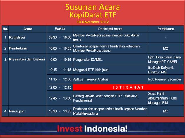 Kelas “Kopi Darat” mengenai ETF akan diselenggarakan pada tanggal 10 November 2012 pukul 10.00 - 12.00 dengan rincian: