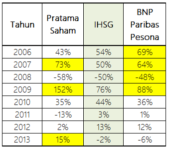 Saya penasaran juga dengan yang ditanyakan sis armita dan bro bekicotliar ttg RDS Pratama Saham, saya coba olah data kinerja per tahun dari RDS Pratama Saham dan BNP Paribas Pesona, plus saya sandingkan juga kinerjanya dengan IHSG. Hasilnya dapat dilihat pada gambar berikut: