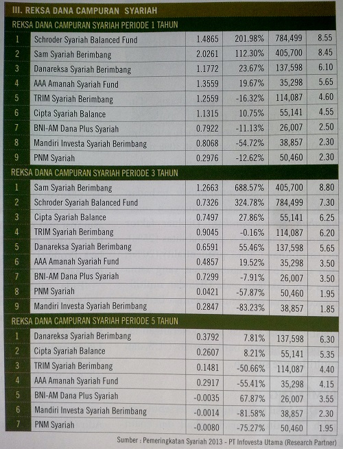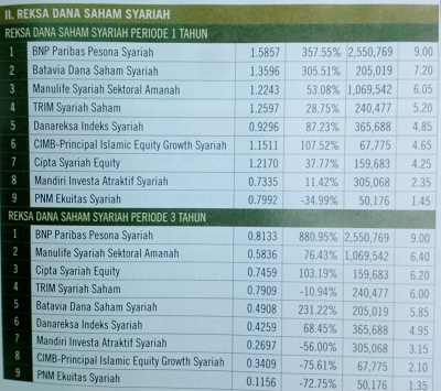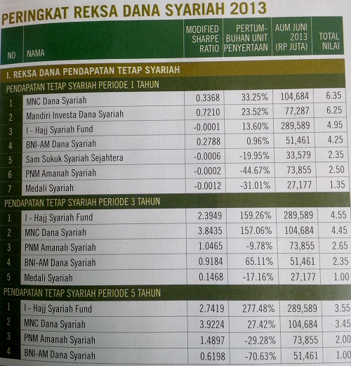 Urutan nomor 1 nya (untuk semua periode) adalah BNP Paribas Pesona Syariah. Ini cocok dengan yang muncul di daftar ranking produk reksadana periode 5YR. Produk tsb adalah RDS syariah yang muncul teratas, di urutan nomor 12. Pls note bahwa yang tampil disana adalah data per 2 Agustus 2013, artinya produk ini sudah mengalami "masa kelam" bursa jatuh kemarin. Kinerja 5YR nya 19,69% (annualized), dan sudah 3x outperform market.