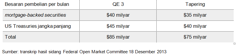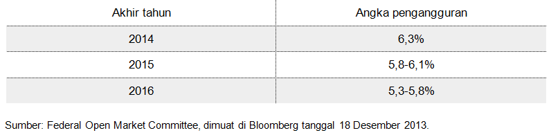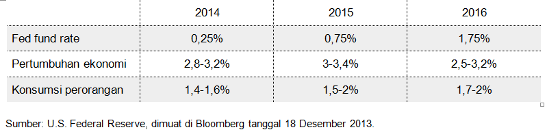 ![]() Akhirnya keputusan itu keluar: bank sentral Amerika Serikat, U.S. Federal Reserve, mengumumkan pengurangan stimulus moneternya, atau yang dikenal dengan istilah tapering. Meskipun keputusan ini merupakan kejutan bagi banyak pelaku pasar, namun hal ini sebaiknya disikapi sebagai vote of confidence bahwa pemulihan ekonomi AS sudah semakin mantap dan akhirnya menjawab pertanyaan pasar tentang kapan the Fed akan mengurangi pembelian obligasinya, sehingga membuat pasar lega. Berdasarkan transkrip hasil sidang Federal Open Market Committee (FOMC) the Fed yang dirilis tanggal 18 Desember 2013, tapering akan dimulai pada bulan Januari 2014 dengan mengurangi jumlah pembelian obligasi dan mortgage-backed securities (MBS) dari sebelumnya sebesar $85 milyar menjadi $75 milyar per bulan, setara dengan pengurangan $10 milyar per bulannya. Adapun rinciannya adalah sebagai berikut: Tabel 1: Rincian besaran pembelian sebelum dan sesudah tapering Dengan nilai kepemilikan the Fed atas obligasi pemerintah AS jangka panjang yang masih tinggi, diharapkan hal ini dapat menekan tingkat suku bunga jangka panjang agar tetap rendah, menyokong pasar kredit perumahan (mortgage), serta membantu membuat kondisi finansial secara keseluruhan menjadi lebih akomodatif, sehingga pada gilirannya akan membantu memperkuat pemulihan ekonomi dan memastikan bahwa inflasi akan berada di tingkat yang konsisten dengan dwi mandat the Fed. Selain itu, FOMC juga akan memantau secara ketat informasi ekonomi dan keuangan dala beberapa bulan ke depan, dan melanjutkan pembelian US Treasuries jangka panjang dan mortgage-backed securities serta memberlakukan kebijakan yang dianggap pantas sampai prospek pasar ketenagakerjaan telah membaik secara substansial dalam konteks kestabilan harga. Jika memang informasi yang didapat mendukung ekspektasi FOMC akan perbaikan pasar tenaga kerja dan kembalinya tingkat inflasi ke objektif jangka panjang, maka kemungkinan the Fed mengurangi besaran pembelian mortgage-backed securities dan US Treasuries lebih lanjut dalam rapat FOMC di masa mendatang. Lebih lanjut the Fed juga menegaskan kembali ekspektasinya bahwa target suku bunga (Fed fund rate) tetap berada di kisaran sangat rendah sebesar 0-0,25% selama angka pengangguran masih berada di atas level 6,5%, inflasi selama 1-2 ke depan tidak lebih dari 2,5% dan ekspektasi inflasi jangka panjang masih rendah. Mengenai prospek pasar tenaga kerja, the Fed memperkirakan angka pengangguran akan turun menjadi 6,3% di akhir tahun depan - sebelumnya di bulan September the Fed memprediksi angka pengangguran akhir tahun 2014 adalah di kisaran 6,4-6,8%. Angka pengangguran diprediksi turun lebih lanjut: 5,8-6,1% di kuartal keempat 2015 dan 5,3-5,8% di akhir 2016. Tabel 2: Proyeksi angka pengangguran AS Berdasarkan uraian the Fed di atas, berikut adalah 3 poin penting yang perlu kita sikapi menyusul keputusan the Fed untuk melakukan tapering: Bahkan, ternyata saham AS ternyata rally menyusul pengumuman the Fed atas tapering pada 18 Desember 2013. Dow Jones industrial average melonjK 292.71 poin (+1,84%) menjadi 16.167,97 - angka penutupan tertingginya sepanjang sejarah. Demikian pula dengan S&P 500 yang juga mencapai rekor tertingginya; melaju 29,65 poin (+1.66%) menjadi 1.810,65. Sementara indeks Nasdaq Composite juga tidak mau ketinggalan: naik 46,384 poin (+1.15%) menjadi 4.070,064. Ini menunjukkan bahwa pasar saham AS menanggapi positif pengumuman tapering ini, karena keputusan the Fed ini mengindikasikan bahwa ekonomi AS telah berangsur pulih. Pasar saham Eropa dan Asia juga rally menjelang pengumuman tapering, mengindikasikan optimisme atas pemulihan ekonomi dan membaiknya prospek ketenagakerjaan AS. 2. Akan terjadi penghindaran risiko. Sebenarnya fenomena ini sudah mulai terjlihat sejak pertengahan kuartal kedua tahun imi, saat the Fed mulai mengisyaratkan akan melakukan tapering. Komoditas dan pasar modal di negara berkembang terimbas parah, namun saham-saham blue chips AS tetap berkinerja baik. Kemungkinan koreksi pasar akan terjadi atas aset-aset yang lebih berisiko, sementara pasar saham AS kelihatannya tidak akan ambruk karena prospek tapering sudah diperkirakan sebelumnya (priced in). Pertanyaan lebih lanjut adalah apakah pemulihan ekonomi AS akan bertahan setelah pengurangan stimulus ini. Jika tidak, maka pendapatan emiten akan turun sehingga pasar saham AS akan terkoreksi. Sebuah artikel berjudul "Fragile five face taper crunch" yang dimuat di Financial Times tanggal 17 Desember 2013 mengindentifikasikan 5 negara yang paling rentan terimbas tapering: (1) Brasil, (2) India, (3) Indonesia, (4) Afrika Selatan dan (5) Turki. Bank sentral di kelima negara ini telah menaikkan suku bunga guna mempertahankan nilai tukar mata uangnya. Namun pemerintah kelima negara ini masih harus menyelesaikan berbagai masalah, mulai dari reformasi domestik - termasuk soal perpajakan dan buruh - untuk menpang pertumbuhan ekonomi serta menarik investasi jangka panjang. Selain itu kelima negara ini akan menyelenggarakan pemilihan umum di tahun 2014. 3. Suku bunga akhirnya akan naik, meski tidak seketika. The Fed telah menyatakan dengan jelas bahwa akhir dari program pembelian obligasi dan mortgage-backed securities tidak berarti berakhirnya periode panjang dengan tingkat suku bunga rendah. Ini penting kenaikan suku bunga rata-rata mortgage sebesar 1,25% ini terbukti telah melemahkan sektor perumahan AS. Dengan tingkat inflasi dan permintaan akan barang dan jasa yang masih rendah saat ini, diperkirakan tingkat suku bunga akan dipertahankan tetap rendah hingga 2015 atau bahkan lebih lama lagi. Mayoritas anggota komite FOMC - 12 dari 17 - memperkirakan kenaikan tingkat suku bunga akan mulai terjadi di tahun 2015, 2 anggota memperkirakan kenaikan suku bunga terjadi di 2014 dan 3 anggota memperkirakan akan terjadi di 2016. Nilai tengah (median) resmi perkiraan Fed fund rate adalah sebesar 0,75% di akhir tahun 2015 dan 1,75% di akhir 2016. Untuk pertumbuhan ekonomi the Fed mempred