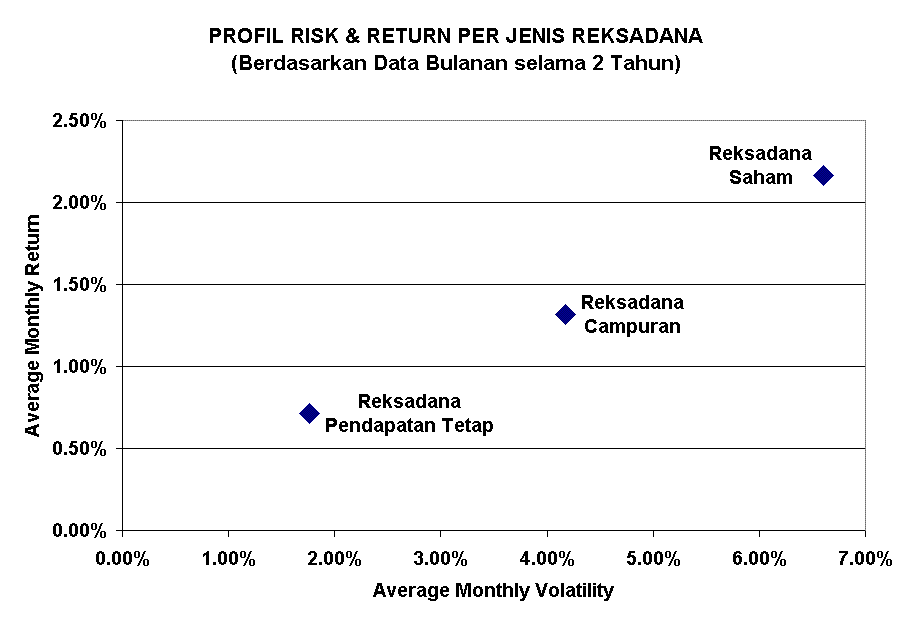 ![]() Salah satu prinsip investasi yang sangat penting adalah diversifikasi. Kita bisa saja meletakkan investasi kita dalam satu instrumen yang kita anggap paling baik dan tepat untuk kita. Sayangnya, seluruh jenis instrumen investasi memiliki satu hal yang sama, yaitu risiko. Kita tidak pernah tahu apakah suatu saat nanti terjadi penurunan yang tajam pada investasi kita. Jika kita hanya memiliki satu instrumen investasi, tentu dampaknya akan sangat besar bagi kita. Oleh karena itu kita sebaiknya meletakkan investasi kita di kelas aset yang berbeda. Minimal kita menaruh di beberapa jenis instrumen yang berbeda profilnya. Ilustrasi mengenai kegunaan diversifikasi ada di tulisan saya sebelumnya di sini. Untuk reksadana, mari kita lihat grafik berikut. Grafik di bawah ini menggambarkan profil return dan risiko masing-masing tipe reksadana. Data yang dipakai adalah data bulanan selama dua tahun dengan data terakhir adalah bulan Juli 2008. (klik pada gambar untuk memperbesar)