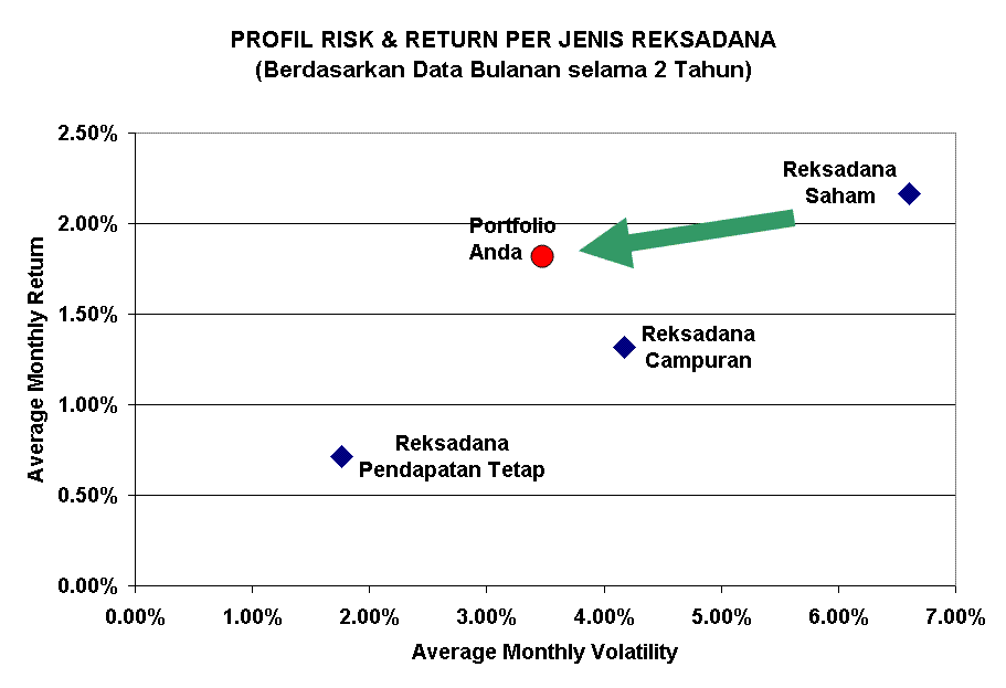 Terlihat bahwa masing-masing jenis reksadana memiliki profil yang berbeda-beda. Satu kesimpulan yang bisa kita dapatkan adalah semakin besar return, maka risikonya pun semakin besar. Reksadana pendapatan tetap memiliki risiko terendah, namun menawarkan ekspektasi return yang tidak terlalu besar pula. Reksadana saham menawarkan ekspektasi return yang besar namun diimbangi pula dengan tingginya risiko yang harus kita tanggung. Kalau begitu apakah kita hanya bisa pasrah saja menerima profil seperti itu? Tentu tidak. Satu hal lagi, pernahkan terpikir oleh Anda untuk mengoptimalkan komposisi portfolio Anda?