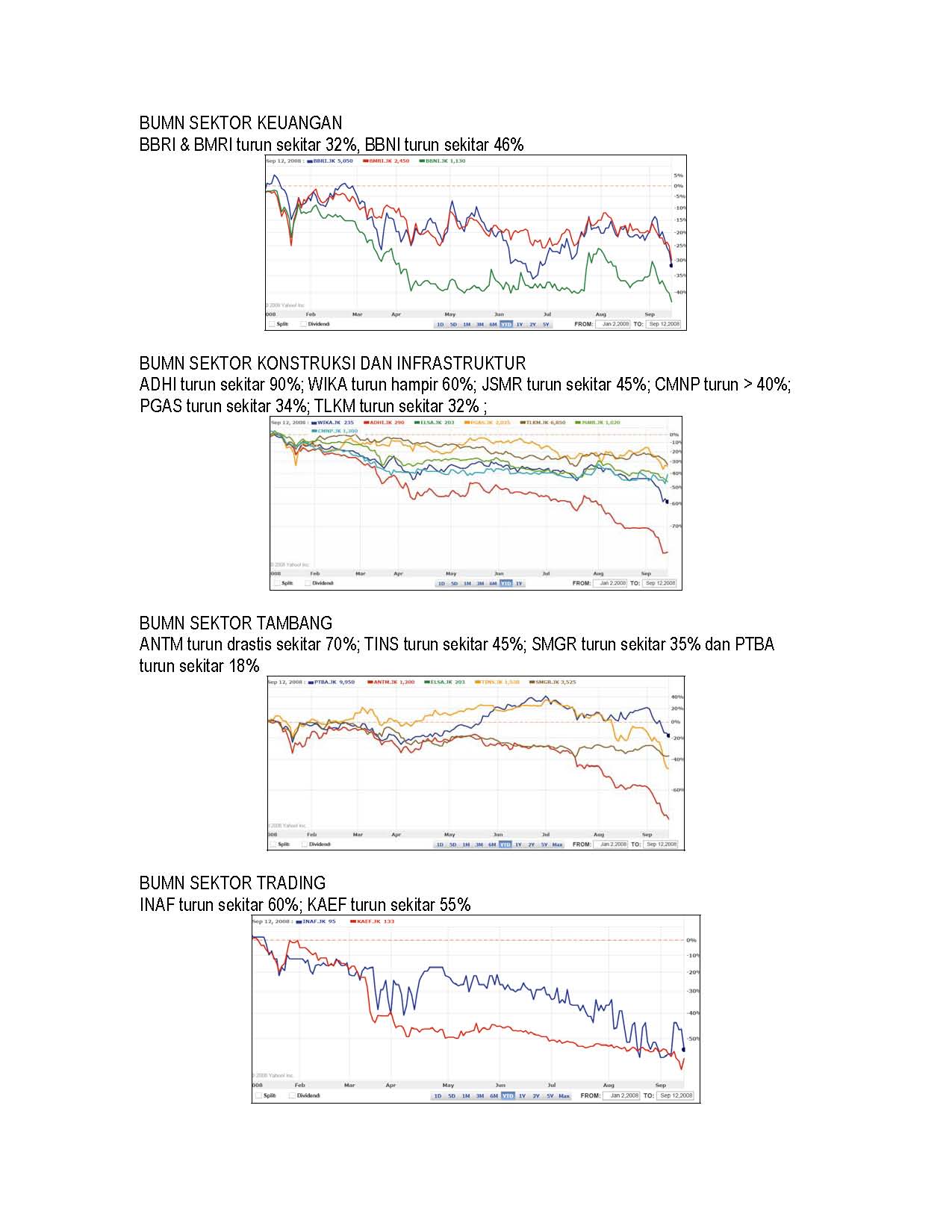 SAHAM BUMN (Kesempatan berinvestasi disaat merah) Saham BUMN yang sudah diperdagangan di pasar bursa saham juga mengalami penurunan. Namun saham-saham tersebut memiliki fundamental yang baik, sehingga diharapkan dapat terangkat cepat diasaat pasar rebound. Seperti terlihat pada graphik saham BUMN, saat ini terbagi dalam 5 sektor yaitu :