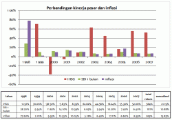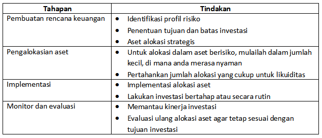 Volatilitas pasar yang tinggi dan kondisi ekonomi yang masih belum menentu sampai saat ini telah menambah urgensi bagi investor untuk berpikir keras mengenai langkah-langkah apa yang perlu dilakukan terhadap investasinya. Bukan hal yang mudah memang, apalagi mengingat begitu cepat dan makin tak terduganya arah pergerakan pasar, namun sebenarnya sebelum investor menentukan langkah yang harus diambil, sebenarnya investor harus merumuskan dulu alokasi aset strategisnya karena dengan alokasi aset strategis inilah investor mempunyai dasar untuk pengambilan keputusan investasi. Dalam kesempatan ini penulis mencoba memberikan ulasan mengenai apakah alokasi aset strategis itu serta memberikan ilustrasi mengenai bagaimana aset alokasi strategis bisa membantu investor mencapai pertumbuhan investasi yang optimal. Investasi memerlukan proses, tidak bisa dicapai serta merta begitu saja, oleh karena itu investor perlu menghindari jalan pintas untuk memperoleh keuntungan besar dalam jangka waktu singkat. Untuk bisa melakukan proses investasi dengan baik, investor memerlukan ilmu, kesabaran serta disiplin. Investor juga perlu memahami bahwa setiap investasi memiliki dua sisi: imbal hasil dan risiko, di mana keduanya memiliki korelasi positif: potensi imbal hasil yang tinggi selalu diikuti dengan risiko yang tinggi pula. Namun risiko bukanlah hal yang harus dihindari, melainkan harus dikelola. Ini berarti investor harus mengambil tingkat risiko tertentu dalam investasinya sesuai dengan profil risikonya. Karena itu, proses investasi merupakan bagian dari strategi mengelola risiko. Berikut adalah tahapan-tahapan proses investasi: Alokasi aset strategis adalah pengalokasian porsi aset sesuai dengan horison investasinya. Perumusan ini dilakukan sesuai dengan tujuan dan batasan investasi investor, serta dengan mempertimbangkan profil resikonya. Mengapa alokasi aset strategis penting? Selain untuk memenuhi tujuan investasi sesuai dengan jangka waktunya serta menjaga likuiditas, alokasi aset strategis juga penting untuk diversifikasi (penyebaran risiko, yaitu dengan berinvestasi di beberapa instrumen investasi sehingga risiko investasinya bisa disebar). Grafik dan tabel berikut memperlihatkan perbandingan kinerja pasar modal dibandingkan dengan tingkat inflasi selama 10 tahun terakhir di Indonesia: Dari tabel di atas dapat dilihat bahwa jika investor menginvestasikan seluruh kekayaannya di SBI 1 bulan selama 10 tahun berturut-turut, maka imbal hasil yang didapat adalah 10.88% per tahunnya. Sedangkan jika ia menginvestasikan seluruhnya di saham, maka imbal hasilnya berkisar sekitar 21% per tahunnya. Sedangkan inflasi selama 10 tahun terakhir, jika diambil rata-rata geometrikanya, adalah sebesar 13.83%. Ini berarti bahwa jika investor hanya berinvestasi di SBI saja (atau secara lebih luas di instrument pasar uang), maka imbal hasil per tahunnya kemungkinan besar tidak bisa mengalahkan inflasi sehingga mengakibatkan ia kemudian sulit untuk mempertahankan gaya hidupnya karena kekayaannya semakin tergerus oleh inflasi. Dengan mengkombinasikan berbagai instrument dengan porsi tertentu maka diharapkan investor dapat memperoleh imbal hasil total yang cukup tinggi sehingga bisa mengalahkan inflasi. Mari sekarang kita lihat berapa imbal hasil yang didapat investor jika selama periode 1998-2007 ia menginvestasikan 60% kekayaannya di instrumen pasar uang (deposito atau SBI), dan 40% di saham. Grafik dan tabel berikut mengilustrasikan imbal hasil serta porsi masing-masing instrumen per tahun: