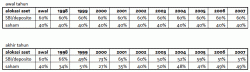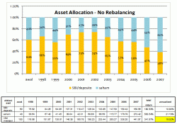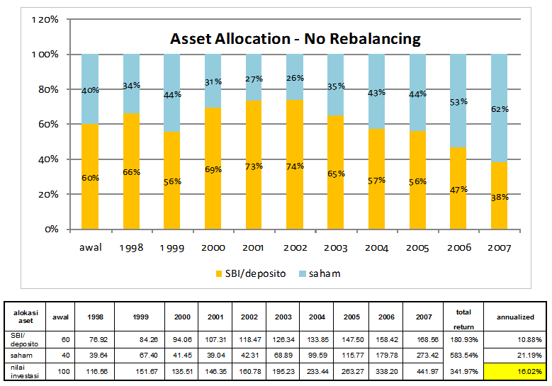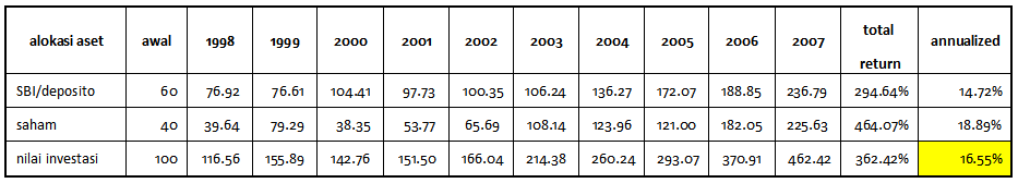 Dari tabel di atas terlihat bahwa dengan melakukan alokasi aset sebesar 60% di SBI/deposito dan 40% di saham pada saat awal investasi, ternyata investor bisa meraih imbal hasil total sebesar 16.02% per tahun selama periode 1998-2007 – lebih tinggi dari tingkat inflasi sebesar 13.83% per tahunnya. Nah, kalau ilustrasi di atas menunjukkan kinerja portofolio tanpa rebalancing (hanya menetapkan porsi aset di awal investasi dan membiarkannya naik-turun seiring dengan perkembangan pasar), coba sekarang kita lihat bagaimana kinerja portofolio jika investor melakukan rebalancing, yaitu dengan mengembalikan porsi di pasar uang menjadi 60% dan di saham sebesar 40% pada setiap awal tahun: