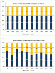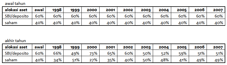 Perkembangan porsi aset pada awal dan akhir tahun adalah sebagai berikut: Yang menarik, ternyata disiplin mengembalikan alokasi pasar uang-saham ke level 60-40 (rebalancing) menghasilkan imbal hasil total yang lebih tinggi daripada imbal hasil dari investasi tanpa rebalancing! :) Ada hal penting yang perlu disimak investor mengenai proses rebalancing: yaitu bahwa rebalancing memungkinkan investor merealisasikan keuntungan di aset yang mengalami kenaikan dan memasukkan keuntungan itu ke aset lainnya dalam portofolio. Jadi misalnya pasar saham naik pesat sehingga porsi saham di portofolio investor menjadi 65% (sedangkan pasar uang menjadi 35%) maka investor akan menjual sebagian saham (yang berarti melakukan profit-taking) untuk mengembalikan porsi saham di portofolionya ke level 60% dan memasukkan capital gain dari saham ke pasar uang sehingga porsi pasar uang di portofolionya kembali ke 40%. Sebaliknya jika pasar saham turun sehingga porsi saham di portofolio turun menjadi 25% (sedangkan porsi pasar uang naik menjadi 75%), maka investor bisa mengalokasikan sebagian porsi di pasar uangnya untuk membeli saham sehingga mengembalikan porsi saham ke 40% dan pasar uang ke 60%. Dengan demikian, investor pun konsisten membeli di saat pasar sedang turun dan menjual saat pasar naik (buy low, sell high). Selain itu, dengan secara konsisten dan disiplin mengembalikan alokasi 60-40 setiap tahun, investor juga mengelola risiko investasinya agar selalu sesuai dengan profil risikonya. Dengan demikian, investor tidak perlu menanggung risiko yang lebih tinggi dari tingkat risiko yang bisa ditolerirnya setelah pasar mengalami kenaikan, sementara saat pasar turun investor bisa memanfaatkan peluang meraih imbal hasil karena penurunan pasar memberikan ruang bagi investor untuk menambah investasi. Jadi kesimpulannya disiplin dalam alokasi aset penting bagi investor untuk mencapai tujuan investasinya sekaligus menjaga agar tingkat risikonya terjaga.
