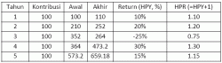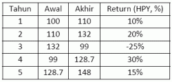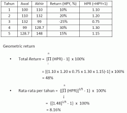 Perhitungan historical return dengan menggunakan arithmetic return memberikan informasi yang salah, karena hanya menghitung rata-rata kinerja, tidak memperhitungkan efek bunga berbunga (compounding effect) dari investasi – dalam hal ini lebih tepat digunakan geometric return. Untuk menghitung total return (kinerja) selama 5 tahun, digunakan rumus TR = (nilai akhir – nilai awal)/(nilai awal) x 100% = (148-100)/100 x 100% = 48%. Angka 48% ini juga bisa diperoleh dengan metode geometric return. Untuk menghitung geometric return, kita gunakan variabel Holding Period Return (HPR) = 1+HPY.