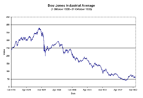 ![]() Mungkin inilah crash terburuk dalam sejarah Amerika Serikat. Crash ini telah memicu terjadinya depresi yang berkepanjangan. Terdapat tiga istilah yang mewakili dimulainya crash ini, yaitu Black Thursday, Black Monday, dan Black Tuesday. Black Thursday mengacu pada hari Kamis tanggal 24 Oktober 1929 di mana Dow Jones Industrial Average (DJIA) turun sebesar 2.09%. Pada hari itu, jumlah saham yang diperdagangkan mencapai 12.9 juta lembar, tiga kali lipat dari kondisi normal. Black Monday mengacu pada hari Senin tanggal 28 Oktober 1929 di mana DJIA mengalami penurunan tajam sebesar 13.47% dalam sehari (dari penutupun hari Jumat di 301.22 ke 260.64 pada penutupan perdagangan hari Senin). Black Tuesday mengacu pada tanggal 29 Oktober di mana DJIA turun tajam sebesar 11.73% dengan volume yang sangat besar. Pada hari itu, jumlah saham yang diperdagangkan mencapai 16.4 juta lembar. Rekor jumlah lembar saham yang diperdagangkan pada hari itu tidak terpecahkan sampai dengan 40 tahun kemudian pada tahun 1968. DJIA terus merosot sampai ke titik nadirnya pada tanggal 8 Juli 1932 di 41.22. Penurunan dari titik tertinggi ke titik terendah adalah sekitar 89%. Level tertinggi DJIA di 386.1 yang dicapai pada tanggal 3 September 1929 tidak terlampaui sampai dengan tahun 1954.