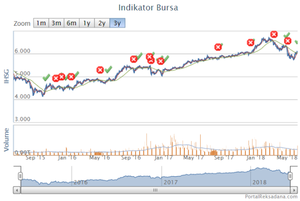 ![]() Sebuah Artikel Oleh Passion4U & Dunkz He who knows when he can fight and when he cannot, will be victorious. Tidak terasa ternyata sudah 3 tahun Portal Reksadana menjadi teman kita untuk saling berbagi tentang pengalaman, tips dan trick dalam berinvestasi reksadana. Sebuah perjalanan yang cukup panjang dan mendebarkan bagi PortalReksadana.com. Perjalanan yang panjang, karena biasanya portal yang idealis nan gratis jarang yang panjang umurnya. Mendebarkan karena beberapa kali portal ini nyaris mati suri, dan hanya karena bantuan para membernya maka portal ini kembali hidup dan bernafas. Kali ini Passion4U & Dunkz mau bercerita tentang sebuah indicator sederhana, namun powerful (sekaligus sedikit berbahaya) bernama indicator bursa (tadinya indicator ini mau dikasi nama My Swing, tapi entah kenapa enggak jadi hehehe). Indicator ini bisa anda akses di http://www.portalreksadana.com/rdbursa . Indikator ini diharapkan akan menjadi salah satu tools kita untuk sukses berinvestasi di reksadana (khususnya reksadana saham). Kenapa indicator ini dibuat dan apa istimewanya indicator ini, mari kita simak ceritanya dibawah ini. Alkisah, di sebuah kota besar, hiduplah sebuah keluarga muda. Setelah beberapa tahun berumah tangga dan melahirkan anak yang lucu, mereka tersadar bahwa untuk dapat menjamin kebahagiaan rumah tangga dan kehidupan anak mereka kelak, mau tidak mau mereka harus mulai meninggalkan kebiasaan yang hanya menabung menjadi berinvestasi. Untunglah dari hasil browsing di internet, mereka berhasil menemukan situs PortalReksadana.com yang banyak membantu mereka dalam merencanakan investasi. Dengan semangat 45, keluarga muda ini mulai menyusun rencana investasi dengan menggunakan feature My Plan. Sayangnya langkah untuk berinvestasi mereka agak terhambat, Cerita dari tetangga sebelah tentang investasi reksadana sahamnya yang mengalami kerugian besar saat kejatuhan bursa tahun 2008, cukup membuat keluarga muda ini berfikir ulang untuk mulai berinvestasi. Keluarga muda ini tidak ingin dana investasi yang dikumpulkan dengan susah payah juga ikutan nyungsep seperti pengalaman tetangganya, mereka mulai bertanya-tanya apakah ada indicator yang cukup sederhana dan mudah dimengerti bagi keluarga muda ini yang bisa memastikan investasi mereka terus berkembang mengikuti perkembangan pasar? apakah ada early warning signal yang memberikan petunjuk pada pasangan ini jika market jatuh lagi suatu saat nanti? Kalo anda punya cerita yang kurang lebih sama dengan cerita keluarga muda di atas, maka anda sungguh beruntung bro adityo yang baik hati telah mau bersusah payah membuatkan tools untuk anda. Tools ini didasarkan atas article “Optimalisasi penggunaan periode moving average (2)” postingan bro dunkz (lihat di http://www.portalreksadana.com/node/396) yang memuat hasil back testing atas pergerakan bursa sejak jaman jebot sampe sekarang. Ok, bro Passion4U & bro Dunkz, udahan dong pengantarnya, tunjukin kita-kita cara makenya dong …. Ok dech, kita mulai ya … secara umum indicator ini terdiri atas 2 bagian. Bagian yang atas merupakan grafik harga IHSG yang telah dioverlay dengan Moving Average 6 dan 37. Sementara bagian bawah merupakan grafik volume IHSG dengan overlay Moving Average 50. Waduh apaan tuch … tenang kali ini kita tidak akan membahas secara detail dasar teori pembuatan indicator yang njelimet itu. Tapi kita akan membahas cara menggunakan indicatornya. Ibarat untuk naik mobil, kita nggak perlu tahu detail tentang cara bikin mobil toch, cukup tahu cara nyetirnya aja dulu. Nanti seiring berjalannya waktu dan meningkatnya awareness kita, akan tiba saatnya kita belajar cara menservice mobil hehehe Dalam tataran praktis bagian atas dari indicator (grafik harga IHSG) ini akan merekomendasikan anda untuk: