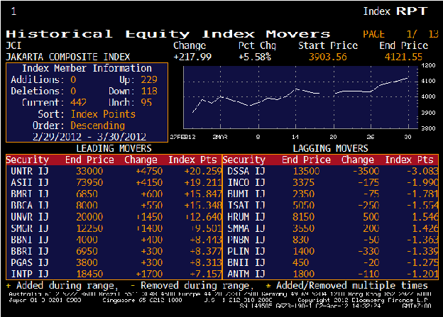 Pasar obligasi lokal Indonesia sebagaimana diukur dengan HSBC Bond Index, turun 1,6% dari 677,192 di bulan sebelumnya menjadi 666,558. Premi risiko sebagaimana tercermin di credit default swap (CDS) atas Indonesia meningkat, di mana CDS bertenor 10 tahun naik dari 211 menjadi 229. Akan tetapi, CDS bertenor 5 tahun sedikit turun dari 167 menjadi 166. Dari segi yield, obligasi korporasi bertenor 1 tahun dengan peringkat AA umumnya diperdagangkan di kisaran 6,2%, SPN 3 bulan ditawarkan di 3% sementara SPN 1 tahun di 4%. Sebagian besar bank besar menawarkan deposito berjangka 1 bulan di 6%. Untuk portofolio obligasi saat ini kami mengambil posisi underweight relatif terhadap tolok ukur portofolio kami yaitu HSBC Bond Index dengan pertimbangan bahwa untuk tahun 2012 potensi imbal hasil di efek pendapatan tetap/obligasi sudah terbatas. Jika pada tahun 2011 pasar obligasi Indonesia berhasil membukukan imbal hasil sebesar 17%, maka untuk tahun 2012 kami memperkirakan bahwa potensi imbal hasilnya hanya berkisar di 7-8% (setelah dipotong pajak). Dari segi komponen imbal hasil, perolehan bunga kupon akan lebih mendominasi ketimbang capital gain (perolehan laba akibat apresiasi/kenaikan harga). Implementasi strategi portofolio kami lakukan dengan menetapkan durasi portofolio lebih rendah (underweight) daripada durasi tolok ukur dan memanfaatkan setiap momen koreksi di pasar obligasi untuk menaikkan durasi portofolio. Pasar saham Indonesia melaju di bulan Maret seiring dengan laporan kinerja para emiten di kuartal keempat 2011 yang sejalan dengan konsensus. Walaupun mengalami fluktuasi cukup tajam dengan volume perdagangan tipis, IHSG naik 3,42% menjadi 4.121,551 dan LQ 45 membukukan kenaikan 2,86% dan ditutup pada 712,551. Volume perdagangan harian rata-rata turun 19,6% bulan ini menjadi Rp 4,1 trilyun. Investor asing kembali ke pasar saham Indonesia dengan membukukan pembelian bersih sebesar Rp 9,068 trilyun. Pasar melanjutkan rally di akhir bulan di tengah sikap berhati-hati seiring terjadinya protes publik terhadap sidang paripurna DPR mengenai wacana kenaikan harga BBM.