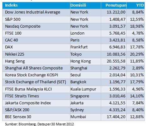![]() Saat ini kita sudah mengakhiri kuartal pertama tahun 2012 dan memasuki kuartal kedua kita masih mendengar berita yang kurang lebih sama, yaitu krisis ekonomi yang mendera negara-negara maju terutama Amerika Serikat dan Uni Eropa, meskipun kondisinya mulai berangsur membaik seiring dengan semakin banyaknya aliran berita positif dari kedua wilayah tersebut. Apa saja yang terjadi di pasar modal global dan Indonesia selama bulan Maret dan bagaimana kami di First State Investments Indonesia menyikapinya dalam bentuk strategi portofolio? Berikut kami sampaikan ulasannya. Terlepas dari sedemikian peliknya krisis ekonomi yang menderanya, data ekonomi di Amerika Serikat mulai menunjukkan geliat perekonomian di negera adikuasa tersebut. Angka pengangguran di bulan Maret tercatat turun dari 8,3% menjadi 8,2%. Di akhir bulan Maret, indeks saham Standard & Poor’s 500 Index naik 0,4% atau 12% sepanjang tahun 2012 – ini merupakan kinerja kuartal pertama yang terbaik dalam kurun waktu 14 tahun. Data departemen perdagangan AS pada tanggal 30 Maret 2012 menunjukkan bahwa tingkat pembelian konsumen naik 0,8% sepanjang bulan Februari; kenaikan ini merupakan kenaikan tertinggi sejak Juli 2011. Tingkat kepercayaan konsumer sebagaimana diukur lewat besaran Michigan confidence index juga naik menjadi 76,2, melampaui konsensus para ekonom yang memperkirakannya di level 74,5. Data manufaktur Amerika Serikat juga menunjukkan perbaikan: Institute for Supply Management’s manufacturing index naik menjadi 53.4 di bulan Maret dan tingkat kepegawaian di pabrik-pabrik naik ke tingkat tertinggi sejak Juni 2012. Laporan Federal Open Market Committee (FOMC) Amerika Serikat menyatakan bahwa kenaikan harga bahan bakar akan menaikkan inflasi untuk sementara waktu. Nampaknya para pengambil kebijakan di FOMC lebih memprihatinkan imbas tingginya harga bahan bakar terhadap pertumbuhan ekonomi dibandingkan ekspektasi inflasi. Dengan demikian respon kebijakan akan berkisar dari tidak melakukan apa-apa hingga pelonggaran likuiditas lebih lanjut. Dalam pertemuan para menteri keuangan zona Euro di Copenhagen, Denmark pada tanggal 30 Maret 2012 disepakati batas maksimum pinjaman penyelamatan sebesar 500 milyar Euro (US$ 666 milyar), di mana fasilitas pinjaman ini akan tersedia dalam bentuk tunai mulai bulan Juli melalui dana talangan permanen yang disebut European Stability Mechanism (ESM). Bersama dengan fasilitas ESM, tersedia pula 200 milyar euro yang sudah disepakati sebelumnya lewat European Financial Stability Facility (EFSF). Selain itu terdapat pula 53 milyar euro pinjaman bilateral yang sudah dikucurkan ke Yunani serta 49 milyar euro yang dihimpun dalam European Financial Stability Mechanism (EFSM) dan telah disalurkan untuk menanggulangi krisis Euro pertama kali. Diharapkan dengan jumlah total sebesar 800 milyar euro maka zona Euro memiliki daya tahan yang lebih kuat terhadap krisis utang yang menimpanya. Lebih lanjut, keseluruhan dana talangan ini, bersamaan dengan pinjaman dan program pembelian obligasi negara-negara di zona Euro oleh bank sentral Eropa (European Central Bank) bertujuan untuk menunjukkan tekad zona ini untuk mengembalikan kestabilan ekonomi serta mendorong negara-negara G-20 untuk menambah kontribusi untuk dana talangan di International Monetary Fund yang digunakan untuk penanggulangan krisis. Menyikapi berbagai perbaikan di Amerika Serikat dan zona Euro, bursa saham global mengalami rebound cukup signifikan: