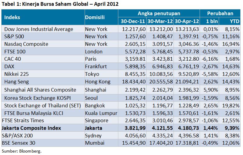 ![]() Memasuki bulan kedua pada kuartal kedua kita masih mendengar berita yang kurang lebih sama, yaitu krisis ekonomi yang mendera negara-negara maju terutama Amerika Serikat dan Uni Eropa. Apa saja yang terjadi di pasar modal global dan Indonesia selama bulan April dan bagaimana kami di First State Investments Indonesia menyikapinya dalam bentuk strategi portofolio? Berikut kami sampaikan ulasannya. Pasar Amerika Serikat tertekan bulan ini menyusul laporan tentang angka pertumbuhan ekonomi kuartal pertama yang lebih buruk dari ekspektasi akibat penurunan belanja bisnis yang meningkatkan kekhawatiran bahwa ekspansi bisnis dapat mengalami perlambatan dalam beberapa bulan ke depan. Pasar Amerika Serikat tertekan bulan ini menyusul laporan tentang angka pertumbuhan ekonomi kuartal pertama yang lebih buruk dari ekspektasi akibat penurunan belanja bisnis yang meningkatkan kekhawatiran bahwa ekspansi bisnis dapat mengalami perlambatan dalam beberapa bulan ke depan. Sebaliknya, angka produksi industri di zona Euro naik sedikit. Hasil lelang obligasi Italia yang cukup baik telah membantu memperbaiki sentimen secara signifikan sehingga menurunkan yield obligasi Italia dan Sanyol. Di lain pihak, indeks pasar saham Inggris turun 0,53% seiring dengan laporan angka pertumbuhan PDB Inggris di kuartal pertama yang kurang bagus, di mana secara teknis Inggris kembali mengalami resesi. Dari Asia, Perdana Menteri China Wen Jiabao menyatakan bahwa perekonomian China secara garis besar masih berada dalam kondisi yang baik dan berada di kisaran pertumbuhan yang baik meskipun mengalami tekanan. Beliau mencatat bahwa China masih memiliki ruang untuk penyesuaian kebijakan fiskal dan melakukan penyesuaian bertahap terhadap kebijakannya pada saat yang diperlukan. Pasar Asia ditutup beragam bulan ini di mana pasar Singapura ditutup melemah 1,06% menyusul naiknya angka pengangguran di kuartal pertama secara tak terduga sementara pasar Hong Kong ditutup menguat 2,6%. Harga minyak mentah Brent turun 2,14% menjadi USD 119.47/barrel. Faktor-faktor seperti meredanya ketegangan di Timur Tengah, kenaikan produksi secara bertahap oleh Arab Saudia serta melemahnya perekonomian dunia merupakan faktor-faktor penyebab menurunnya harga minyak.