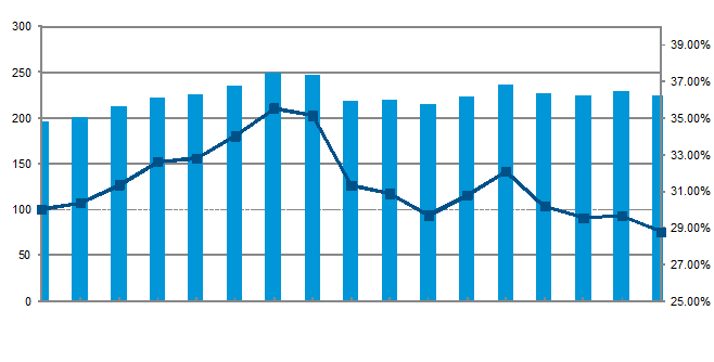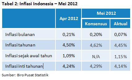 Harga minyak mentah Brent terus menurun, bulan ini tercatat turun 14,5% menjadi USD 101,87/barrel. Inflasi di bulan Mei secara mengejutkan tercatat jauh di bawah ekspektasi. Inflasi bulanan tercatat sebesar 0,07% sementara inflasi tahunan 4,45%. Inflasi nampak terjadi terhadap bahan-bahan makanan yang telah diproses namun diimbangi oleh deflasi di bahan makanan mentah dan bahan sandang. Inflasi tahunan turun dari 4,50% menjadi 4,45% di mana harga bahan makan mentah turun mengimbangi kenaikan biaya impor akibat pelemahan Rupiah. Inflasi inti tahunan juga tercatat menurun dari 4,24% di bulan April menjadi 4.14%. Ekspektasi inflasi mereda setelah harga minyak terus menurun ditengarai lemahnya data perekonomian Amerika Serikat, data manufaktur China yang tidak bagus dan memburuknya krisis utang di zona Euro meredupkan prospek pertumbuhan ekonomi global, yang pada gilirannya membuat rencana pemerintah untuk menaikkan harga BBM menjadi mustahil.
