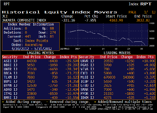 Pasar obligasi lokal Indonesia sebagaimana diukur oleh HSBC Bond Index turun 2,94% dari 670,75 di bulan sebelumnya menjadi 651,07. Premi risiko sebagaimana terlihat dalam besaran credit default swap atas Indonesia naik: CDS 10 tahun naik dari 227 menjadi 305, sementara CDS 5 tahun naik dari 174 menjadi 245. Dari segi yield, obligasi korporasi bertenor 1 tahun dengan peringat AA umumnya diperdagangkan di level sekitar 6,5%, SPN 3 bulan ditawarkan di 4%, sementara SPN 1 tahun di 4,3%. Mayoritas bank besar menawarkan deposito berjangka dengan kisaran bunga di 5,5%-6%. Krisis ekonomi global menggelayuti pasar saham Indonesia di bulan Mei. Keprihatinan atas data perekonomian Amerika Serikat dan krisis di zona Euro memicu kecemasan di kalangan investor. IHSG turun 8,32% menjadi 3.832,82 sementara LQ-45 anjlok 9,32% menjadi 645,694. Angka rata-rata perdagangan harian naik 2% menjadi Rp 5 trilyun di bulan Mei.