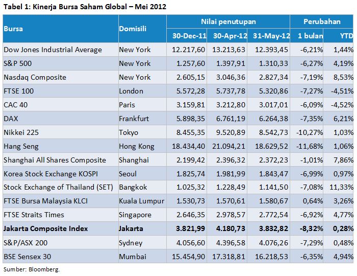 ![]() Memasuki bulan terakhir di kuartal kedua, perekonomian dan pasar modal global masih didera lemahnya pemulihan ekonomi Amerika Serikat dan krisis utang Uni Eropa yang tampaknya semakin pelik. Apa saja yang terjadi di pasar modal global dan Indonesia selama bulan Mei dan bagaimana kami di First State Investments Indonesia menyikapinya dalam bentuk strategi portofolio? Berikut kami sampaikan ulasannya. Pasar saham global anjlok bulan ini ditengarai ketidakpastian atas hasil pemilihan umum di Yunani dan data perekonomian Amerika Serikat yang mengecewakan. Memburuknya data perekonomian Amerika Serikat membuat Dow, S&P dan Nasdaq turun masing-masing 6,2%, 6,3% dan 7,2% di bulan Mei. Dow dan Nasdaq mencatat penurunan bulanan terdalamnya sejak Mei 2010, sementara S&P membukukan penurunan bulanan terdalam sejak September. Angka klaim pengangguran mingguan Amerika Serikat naik untuk 4 minggu berturut-turut. Ekonomi Amerika Serikat di kuartal pertama 2012 tumbuh lebih lambat dari ekspektasi, sehingga meredupkan kepercayaan para investor. Kenaikan harga rumah tidak mampu menopang pasar. Pasar Eropa, sebagaimana diperkirakan, diperdagangkan di level yang lebih rendah bulan ini seiring dengan keprihatinan atas situasi politik Yunani dan kondisi perbankan Spanyol. Lembaga pemeringkat utang S&P memangkas peringkat 11 bank Spanyol. Selain itu, presiden baru Perancis juga dinilai membahayakan kesinambungan program pengetatan ikat pinggang dan European Union sudah mulai menyusun scenario sekiranya Yunani memilih untuk meninggalkan zona Euro. Indeks harga saham di Inggris turun 7,3% bulan ini. Negara-negara Asia seperti China dan India menghadapi perlambatan pertumbuhan ekonomi akibat melemahnya ekspor mereka ke Eropa. Indeks harga saham di Hong Kong dan Singapura anjlok masing-masing 6,9% dan 11,7%.