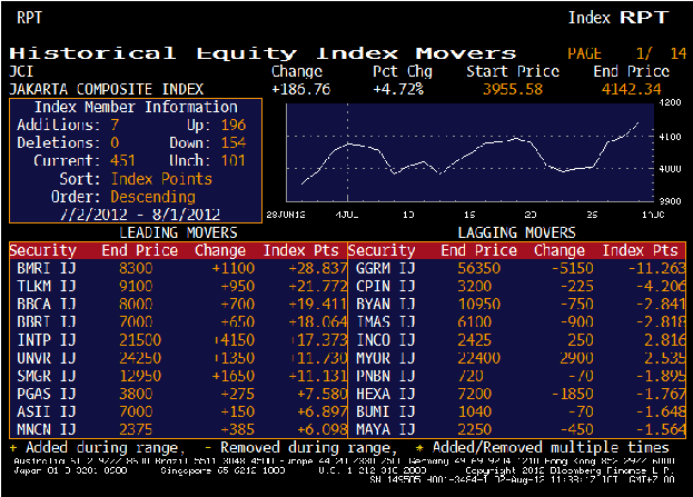 Sumber: Dirjen Pengelolaan Utang Depkeu RI Pasar obligasi lokal Indonesia sebagaimana diukur dengan HSBC Bond Index naik 3,9% menjadi 692 dari 666 di bulan lalu. Premi risiko sebagaiman diukur oleh credit default swap (CDS) atas Indonesia turun: CDS 10 tahun turun dari 270 menjadi 238 dan CDS 5 tahun turun dari 192 Dari segi yield, obligasi korporasi bertenor 1 tahun dengan peringkat AA umumnya diperdagangkan di kisaran 6,4%, SPN 3 bulan ditawarkan di 4,1%, sementara SPN 1 tahun di 4,5%. Mayoritas bank-bank besar menawarkan deposito berjangka tenor 1 bulan di 6,25%. Pasar saham Indonesia melanjutkan kenaikannya di bulan ini sejalan dengan rally di pasar global. IHSG menanjak 4,72% menjadi 4.142,337 dan LQ-45 melonjak 5,63% menjadi 712,77 bulan ini. Kinerja keuangan emiten yang bagus semester pertama menolong sentimen terhadap saham-saham Indonesia. Nilai rata-rata perdagangan saham harian naik 30% di bulan Juli menjadi Rp 5,2 trilyun. Investor asing membukukan pembelian bersih sebesar Rp 4,586 trilyun bulan ini setelah selama 2 bulan berturut-turut tercatat melakukan penjualan bersih. Astra International, BRI, Bank Mandiri dan United Tractors merupakan saham-saham yang paling banyak ditransaksikan selama bulan ini. Tabel 3: Emiten penggerak IHSG selama Juli 2012