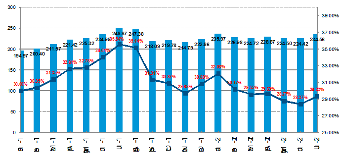 Neraca perdagangan Indonesia masih tercatat mengalami defisit di Juni 2012 – ini merupakan bulan ketiga – seiring dengan penurunan nilai ekspor sebesar lebih dari 16% akibat melemahnya permintaan barang dari luar negeri dan penurunan harga-harga komoditas. Pelemahan ekspor juga kemungkinan disebabkan perubahan perpajakan dan peraturan mengenai ekspor produk mineral mentah. Di sisi lain, impor naik 11%; mencerminkan besarnya tingkat konsumsi, permintaan akan barang-barang investasi serta impor bahan bakar. Defisit neraca perdagangan sebesar USD 1,33 milyar bulan ini menggerus surplus sejak awal tahun menjadi USD 476 juta. Defisit ini menjadi bukti bahwa telah terjadi perlambatan ekonomi di mitra dagang Indonesia seperti Cina, Eropa, Jepang dan India, dan ini bisa memberikan ancaman terhadap Rupiah yang telah terdepresiasi 3,4% sejak awal tahun. Di akhir bulan, Rupiah ditutup melemah 0,65% menjadi 9.454/USD. Setelah sempat keluar dari pasar Indonesia selama beberapa bulan sebelumnya, para investor asing telah kembali akhir-akhir ini sehingga mendongrak kinerja pasar saham dan obligasi. Di akhir bulan, investor asing tercatat menambah kepemilikan mereka di obligasi menjadi IDR 235 Grafik 1: Porsi kepemilikan asing di Surat Berharga Negara yang diperdagangkan