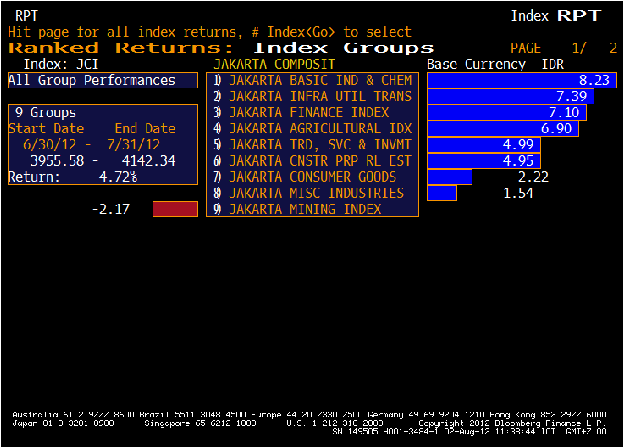 Sumber: Bloomberg Sektor industri dasar dan infrastruktur (telekomunikasi) merupakan sektor-sektor yang menopang kenaikan pasar bulan ini. Sektor pertambangan masih tercatat merugi dan merupakan satu-satunya sektor yang membukukan imbal hasil negatif. Indocement Tunggal Prakarsa dan Semen Gresik merupakan saham-saham yang memimpin pergerakan di sektor industri dasar seiring dengan sikap para investor yang menyambut gembira angka penjualan semen yang bagus. Indocement Tunggal Prakarsa membukukan hasil semester pertama yang bagus karena pangsa pasarnya yang naik dan kuatnya ASP. Para investor memburu saham-saham telekomunikasi karena dinilai sebagai saham yang defensif di saat yang bergejolak seperti ini. Kinerja GGRM mengecewakan, hanya mencapai 37% dari ekspektasi laba bersih untuk setahun penuh. Grafik 2: Kinerja sektor-sektor IHSG selama Juli 2012