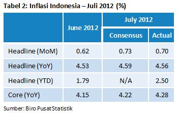 Di bulan puasa ini, inflasi bulanan di Indonesia naik menjadi 0,7% atau setara dengan inflasi tahunan sebesar 4,56%, ditengarai kenaikan harga bahan-bahan makanan pokok. Inflasi inti tahunan juga naik dari 4,2% menjadi 4,3%. Diperkirakan baik inflasi umum maupun inflasi inti akan merangkak naik seiring dengan makin mendekatinya Idul Fitri selain juga karena kenaikan suplai uang. Dewan gubernur BI dalam rapatnya di bulan Juli memutuskan untuk mempertahankan tingkat suku bunga acuan di 5,75% dengan pertimbangan bahwa Indonesia masih berada di tengah perlambatan ekonomi global dan diperkirakan tingkat suku bunga ini masih akan dipertahankan dalam rapat di bulan Agustus.