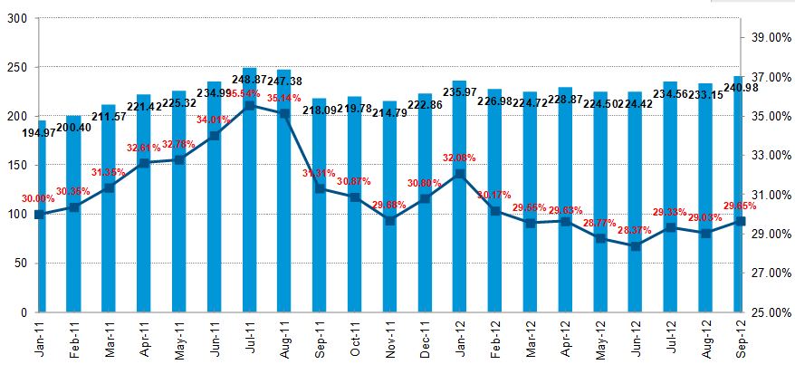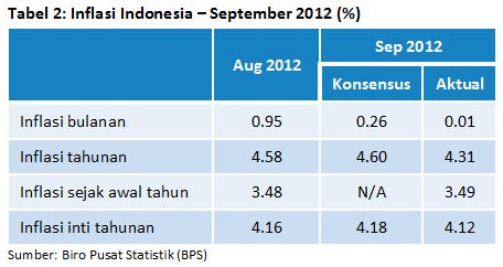 Harga minyak mentah Brent melemah 1,46% menjadi USD112,39/barrel. Angka inflasi bulanan di bulan September mengejutkan para pelaku pasar karena hanya naik 0,01% sehingga indeks harga konsumer tahunan turun menjadi 4,31% dari 4,58% di bulan Agustus. Inflasi inti tahunan juga turun dari 4,16% menjadi 4,12%. Rupiah diperdagangkan melemah di level 9590 dari 9535 setelah mencapai titik puncaknya di pertengahan bulan saat the Fed mengumumkan rencananya melakukan pelonggaran likuiditas jilid ketiga (QE3). Pasar saham dan obligasi lokal menyambut gembira langkah the Fed dengan ekspektasi akan bertambahnya aliran dana yang membeli aset-aset lokal. Akan tetapi, semakin kita mendekati akhir bulan ternyata Rupiah menjadi makin rentan akibat berlanjutnya keprihatinan akan kondisi neraca berjalan dan deficit neraca perdagangan Indonesia. Harga obligasi juga melemah ditengarai keprihatinan yang sama, di mana para pelaku pasar memilih untuk menunggu sampai keluarnya data neraca perdagangan berikutnya. Data yang kemudian keluar adalah bahwa ekspor turun 24% sementara impor turun 8% sehingga terjadi surplus neraca perdagangan sebesar USD250 juta.