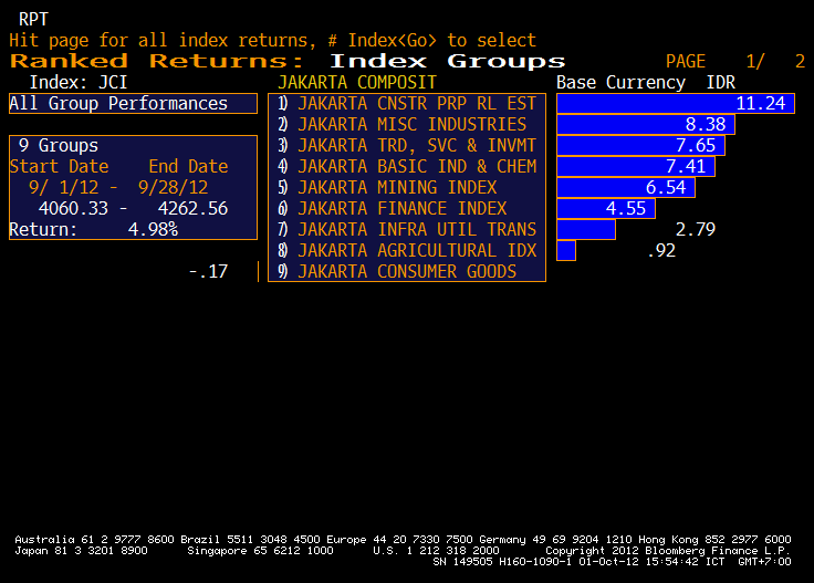 Sumber: Bloomberg Sektor konstruksi dan properti memimpin pergerakan pasar menyusul ekspektasi bahwa gubernur Jakarta yang baru terpilih akan mempercepat belanja infrastruktur. Selain itu, pengumuman rencana ekspansi oleh berbagai perusahaan property serta naiknya angka penjualan mendapatkan tanggapan positif dari para investor. Grafik 2: Kinerja sektor-sektor IHSG selama September 2012