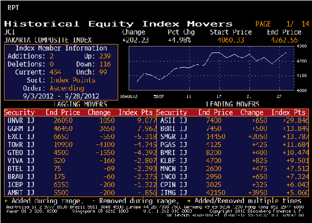 Sumber: Dirjen Pengelolaan Utang, Depkeu RI Pengumuman stimulus Fed dan ECB memicu eforia pembelian di pasar saham Indonesia bulan ini.IHSG melaju 4,98% dan ditutup di level tertingginya sebesar 4.262,561 sementara LQ 45 melambung 5,2% dan ditutup di 731,77. LQ 45 mencapai titik tertingginya di 732,869 di pertengahan bulan. Volume perdagangan harian rata-rata naik 21,6% menjadi Rp 4,5 trilyun bulan ini. Investor asing mencatat pembelian bersih senilai Rp 9,3 trilyun bulan ini. ASII merupakan saham yang paling banyak diperdagangkan di pasar domestik bulan ini. Emiten tambang logam mendapat dorongan dari QE. INCO merupakan salah satu dari 10 saham penggerak terbesar di bursa. ASII menduduki posisi teratas saham penggerak bursa seiring ekspektasi akan kenaikan penjualan musiman setelah Lebaran. Sektor konsumsi merupakan satu-satunya sektor yang membukukan kinerja negatif bulan ini menyusul aksi ambil untung di saham UNVR setelah saham ini menduduki posisi teratas saham penggerak bursa di bulan sebelumnya. Tekanan jual terhadap saham-saham di grup Bakrie berlanjut bulan ini menyusul investigasi Bumi Plc atas kejanggalan dalam keuangan BUMI. Tabel 3: Emiten penggerak IHSG selama Agustus 2012