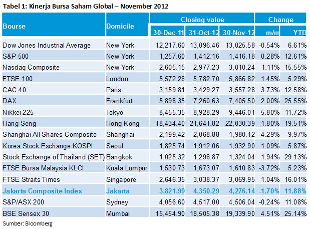 Tanpa terasa kita sudah memasuki bulan terakhir di tahun 2012. Apa saja yang terjadi di pasar modal global dan Indonesia selama bulan November dan bagaimana kami di First State Investments Indonesia menyikapinya dalam bentuk strategi portofolio? Berikut kami sampaikan ulasannya. Ulasan makroekonomi & pasar modal global Bursa saham Amerika Serikat ditutup beragam bulan ini. Setelah terpilihnya kembali Obama, pasar saham AS mengalami tekanan jual yang kuat seiring dengan perkiraan investor bahwa pemerintahan Obama akan menimbulkan jurang fiskal. Pasar saham AS kemudian mengalami rebound seiring dengan secercah harap bahwa kompromi antara kubu Republik dan Demokrat guna menghindari jurang fiskal dapat dicapai. Namun sayangnya tidak ada informasi lebih lanjut mengenai langkah-langkah lain yang dapat ditempuh untuk mengatasi masalah defisit anggaran. Dow turun 0,54% sementara S&P dan Nasdaq masing-masing naik 0,28% dan 1,11%. Bursa saham Inggris naik 1,45% bulan ini mengkonfirmasi kemajuan yang telah dicapai terkait situasi Yunani. Para menteri keuangan zona Euro mencapai kesepakatan untuk memberikan kembali dana talangan sebesar 34,4 milyar euro kepada Yunani yang akan dikucurkan di bulan Desember. Kesepakatan ini meliputi perpanjangan jatuh tempo utang dan penurunan suku bunga utang Yunani. Berita negatif dari Eropa bulan ini juga datang dari Perancis yang peringkat utangnya diturunkan oleh Moody dari Aaa menjadi Aa1 dengan outlook negatif. Bursa-bursa saham besar di Asia membukukan imbal hasil positif bulan ini. Indeks saham Hong Kong naik 1,8% dan Singapura 1,04%. Rebound di sektor manufaktur China memicu sentimen positif. Data manufaktur (PMI) resmi pemerintah China naik dari 50,2 menjadi 50,6 sementara PMI versi HSBC naik dari 49,5 menjadi 50,5. Harga minyak mentah Brent naik 3,41% menjadi USD111,23/barrel bulan ini.