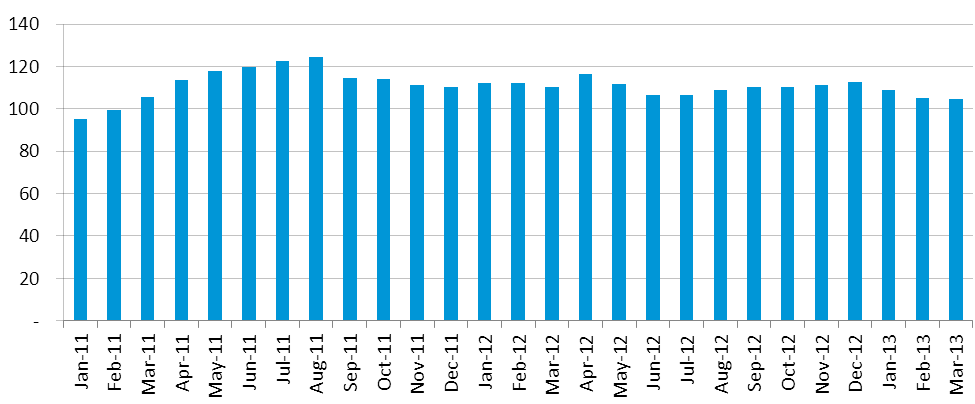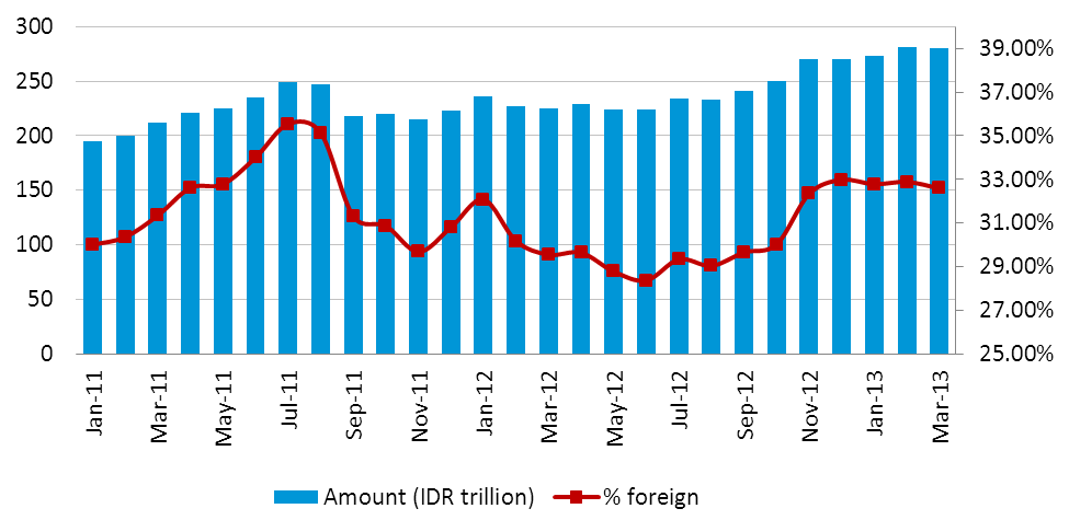 Sumber: Bank Indonesia Cadangan devisa Indonesia pada akhir Maret 2013 kembali melorot setelah sebelumnya di akhir Februari turun US$3,6 milyar. Dikutip dari situs resmi Bank Indonesia, per akhir Maret 2013 cadangan devisa RI tercatat US$ 104,8 milyar atau turun US$400 juta dari akhir Februari yang tercatat US$ 105,2 milyar. BI sebelumnya menyampaikan, penurunan cadangan devisa dipengaruhi oleh impor nonmigas yang diperkirakan cenderung melemah di tengah risiko semakin meningkatnya impor migas yang perlu terus diwaspadai. Di sisi lain, arus modal masuk, baik dalam bentuk investasi langsung (FDI) maupun investasi portofolio, diperkirakan masih cukup tinggi di tengah masih besarnya kebutuhan likuiditas valas domestik, antara lain untuk keperluan impor migas. Cadangan devisa merupakan posisi bersih aktiva luar negeri pemerintah dan bank-bank devisa, yang harus dipelihara untuk keperluan transaksi internasional. Devisa diperlukan untuk membiayai impor dan membayar utang luar negeri. Rupiah sedikit terdepresiasi (-0,62%) menjadi 9.728/US$. Dalam rapatnya di bulan Maret, dewan gubernur BI memutuskan untuk mempertahankan tingkat suku bunga acuan di 5,75% dan diperkirakan mereka akan terus mempertahankannya di bulan April seiring dengan tingkat inflasi inti yang masih stabil di level saat ini. Sebagai gantinya, BI mungkin akan menaikkan tingkat suku bunga FASBI untuk menahan tekanan inflasi dan pelemahan mata uang. Pasar obligasi lokal Indonesia sebagaimana diukur oleh HSBC Local Bond Index turun 1% menjadi 726 dari 733.3. Yield obligasi bertenor 10 tahun naik sedikit menjadi 5,6% menyusul pengumuman tentang angka inflasi yang lebih tinggi sementara Rupiah ditutup melemah di 9.728/USD. Yield obligasi yang lebih tinggi dan mata uang yang melemah merupakan hasil dari ekspektasi inflasi yang lebih tinggi dan aksi para investor asing yang melepas sebagian dari kepemilikan mereka di aset-aset berisiko di tengah ketidakpastian seputar penyelamatan ekonomi Siprus. Investor asing mengurangi kepemilikan mereka di obligasi pemerintah menjadi Rp 281 trilyun di akhir bulan Dari segi yield, obligasi korporasi bertenor 1 tahun dengan peringkat AA umumnya diperdagangkan di kisaran 6%, SPN 3 bulan ditawarkan di 3,5% dari sebelumnya 3,2% sementara SPN 1 tahun di 4,2% dari 3,95% sebulan sebelumnya. Mayoritas bank besar menawarkan deposito berjangka Rupiah bertenor 1 bulan di kisaran 6,25-6,50%. Untuk deposito berjangka USD, bank-bank memberikan 2,25% per tahun untuk penempatan 1 bulan. Porsi kepemilikan asing di Surat Berharga Negara yang Diperdagangkan (SBN) di akhir bulan Maret tercatat sebesar Rp 280,75 trilyun, atau setara dengan 32,59% dari total nilai SBN yang diperdagangkan. Angka ini relatif tidak berubah banyak dibandingkan dengan posisi per akhir Februari di Rp 281,63 trilyun (32,89%). Grafik 2: Porsi kepemilikan asing di Surat Berharga Negara yang Diperdagangkan (Rp trilyun)