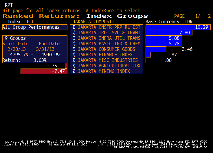 Sumber: Bloomberg ASII dan BBRI adalah saham yang paling ditransaksikan di bursa domestik. Grafik 3: Kinerja sektor-sektor IHSG selama Maret 2013