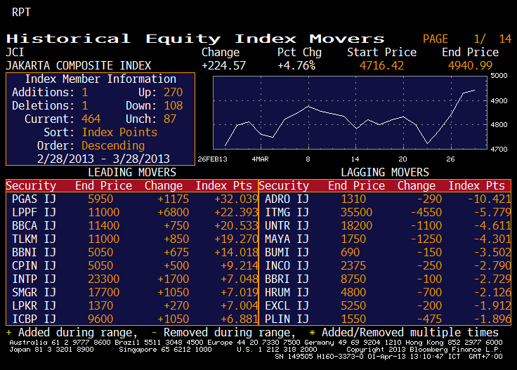 Sumber: Dirjen Pengelolaan Utang, Depkeu RI Pasar saham Indonesia terus mencatat rekor tertingginya di bulan ini meskipun terjadi penjualan besar-besaran oleh investor asing. IHSG naik 3,03% menjadi 4,940.98, sedangkan LQ45 naik 1,5% menjadi 836,87. Nilai rata-rata perdagangan harian meningkat 34,9% m-m menjadi Rp 7.97 trilyun di bulan Maret 2013. Aliran dana masuk net dari investor asing bulan ini turun menjadi Rp 1,8 triliun dari sebelumnya sebesar Rp 11,2 triliun. Tabel 3: Emiten penggerak IHSG selama Maret 2013