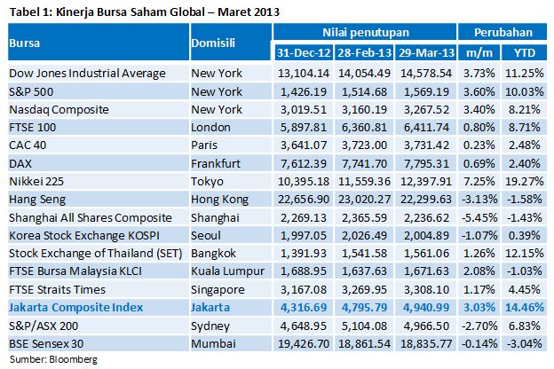 ![]() Tanpa terasa kuartal pertama 2013 telah kita lalui dengan baik. Apa saja yang terjadi di pasar modal global dan Indonesia selama bulan Maret dan bagaimana kami di First State Investments Indonesia menyikapinya dalam bentuk strategi portofolio? Berikut kami sampaikan ulasannya. Ulasan makroekonomi & pasar modal global Pasar saham global mengalami rally bulan ini. Bursa AS mencapai titik tertingginya dengan Dow, S&P dan Nasdaq naik masing-masing sebesar +3.7%, 3,6% dan 3,4%, ditengarai data ekonomi AS yang positif. Survei manufaktur Purchasing Managers’ Index (PMI) AS meningkat menjadi 54,1 di Februari dari 53,1 di Januari, sementara klaim awal pengangguran bulanan tercatat -6,5% di Februari dari +1.1% di Januari. Bursa saham Eropa flat setelah Siprus dan pemberi pinjaman internasional mencapai kesepakatan bailout. Dilaporkan bahwa negara itu akan menerima pinjaman darurat hingga 10 milyar euro (US$ 13 milyar). Eurostoxx dan FTSE ditutup masing-masing dengan kinerja -0.4% dan +0.8%. Pasar Asia ex-Jepang turun sebesar 2,1% di tengah kekhawatiran bahwa kebijakan moneter China bisa bergeser ke arah kebijakan ketat mengikuti peraturan pengetatan di sektor properti (penerapan pajak atas capital gain) dan inflasi yang meningkat (tercatat sebesar 3,2% y-y di Februari, naik dari 2,0% y-y di Januari). Bursa saham Hong Kong turun 3,1% sementara Singapura naik 1,2% Sementara itu, pasar saham Jepang terus menguat dengan membukukan kenaikan 7,25% dipicu oleh pernyataan Gubernur Bank of Japan untuk mempertimbangkan pembelian obligasi pemerintah bertenor panjang dalam jumlah lebih banyak dan menghapuskan aturan yang membatasi skala pembelian aset.