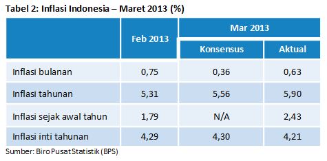 Harga minyak mentah Brent flat di US$110/barrel bulan ini. Ulasan makroekonomi & pasar modal Indonesia Secara mengejutkan, inflasi meningkat menjadi 5,9% y-y di bulan Maret, angka tertinggi sejak Mei 2011. Biro Pusat Statistik menyatakan bahwa inflasi Maret mencapai 0,63% mom. Inflasi tahunan ini tercatat di atas konsensus perkiraan sebesar 5,56%. Seiring dengan itu, inflasi sejak awal tahun (YTD) telah mencapai 2,43%, lebih tinggi dibandingkan periode yang sama tahun lalu sebesar 0,88%. Lonjakan inflasi ini disebabkan oleh kebijakan pemerintah yang ketat untuk impor beberapa produk hortikultura yang menyebabkan kurangnya pasokan bawang putih dan bawang dan harga yang berakibat kenaikan harga atas kedua komoditas tersebut. Respon yang terlambat dari pemerintah untuk membantu merilis produk impor ke pasar mungkin baru dapat membantu mengurangi harga pada bulan April. Namun, inflasi inti tetap stabil; turun sedikit dari 4,29% y-y di bulan Februari ke 4,21% y-y (0,30% m-m), yang sebagian besar disebabkan oleh penurunan harga perhiasan (yang menyumbang deflasi sebesar 0,07 %).