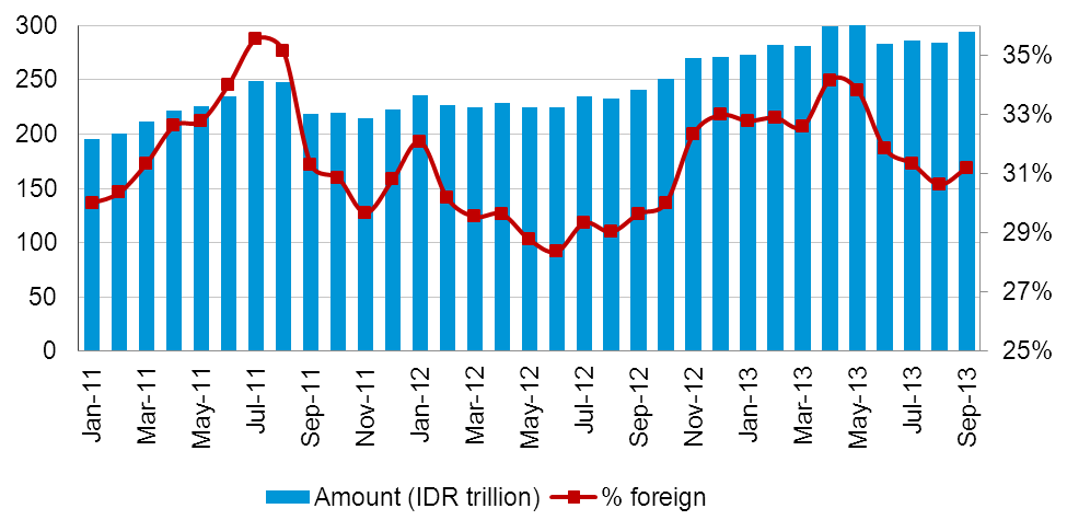 Pada tanggal 12 September Bank Indonesia menaikkan tingkat suku bunga BI dan Fasbi sebesar 25 basis poin menjadi masing-masing 7,25% dan 5,50% untuk membantu menahan pelemahan Rupiah. Cadangan devisa di akhir bulan September naik menjadi $95,675 triyun dari $93 trilyun pada bulan Agustus. Grafik 1: Cadangan devisa Indonesia Januari 2011-September 2013 Investor asing menaikkan porsi kepemilikan obligasi mereka: per akhir September kepemilikan mereka tercatat sebesar Rp 294,14 trilyun (31,20% dari total SBN yang diperdagangkan) dibandingkan dengan Rp 284,01 trilyun (30,64%) di akhir bulan Agustus. Grafik 2: Porsi kepemilikan asing di Surat Berharga Negara yang Diperdagangkan (Rp trilyun) Sedangkan untuk efek pasar uang, SPN 1 tahun diperdagangkan di yield 6,87% dan SPN 3 bulan di 5,48%. Mayoritas bank besar menawarkan deposito berjangka 1 bulan dengan kisaran bunga 7,75-8,50%. Sentimen di pasar saham masih belum bergairah. Di bulan Agustus IHSG ditutup menguat 2,89% menjadi 4.316,18. Semua sektor kecuali konsumer, infrastruktur dan pertanian membukukan kinerja positif selama bulan September. Tabel 3: Emiten penggerak IHSG selama Agustus 2013 Grafik 3: Kinerja sektor-sektor IHSG selama September 2013 Outlook Oktober 2013 Untuk portofolio saham, strategi kami membeli saham-saham berkapitalisasi besar yang telah mengalami koreksi harga cukup dalam di bulan September membuahkan hasil yang menguntungkan terhadap kinerja portofolio kami. Ke depannya kami mengantisipasi pengurangan margin emiten (margin compression) dan melihat adanya peluang untuk menambah kepemilikan saham kami menyusul pengumuman kinerja kuartal ketiga para emiten. Untuk portofolio pendapatan tetap kami menilai bahwa untuk tahun 2013 potensi imbal hasil di efek pendapatan tetap/obligasi sudah terbatas. Dari segi komponen imbal hasil, perolehan bunga kupon akan lebih mendominasi ketimbang capital gain (perolehan laba akibat apresiasi/kenaikan harga). Kami mempertahankan posisi defensif kami dengan menetapkan durasi portofolio di bawah durasi tolok ukurnya sebagai antisipasi atas lonjakan yield obligasi lanjutan akibat tekanan inflasi.